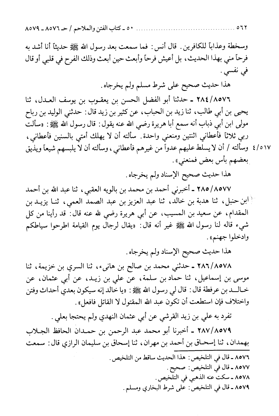 8578 - حَدَّثَنِي مُحَمَّدُ بْنُ صَالِحِ بْنِ هَانِئٍ، ثَنَا السَّرِيُّ بْنُ خُزَيْمَةَ، ثَنَا مُوسَى بْنُ إِسْمَاعِيلَ، ثَنَا حَمَّادُ بْنُ سَلَمَةَ، عَنْ عَلِيِّ بْنِ زَيْدٍ، عَنْ أَبِي عُثْمَانَ، عَنْ خَالِدِ بْنِ عُرْفُطَةَ، قَالَ: قَالَ لِي رَسُولُ اللَّهِ صَلَّى اللهُ عَلَيْهِ وَسَلَّمَ: «يَا خَالِدُ، إِنَّهُ §سَيَكُونُ بَعْدِي أَحْدَاثٌ وَفِتَنٌ وَاخْتِلَافٌ، فَإِنِ اسْتَطَعْتَ أَنْ تَكُونَ عَبْدَ اللَّهِ الْمَقْتُولَ لَا الْقَاتِلَ فَافْعَلْ» تَفَرَّدَ بِهِ عَلِيُّ بْنُ زَيْدٍ الْقُرَشِيُّ، عَنْ أَبِي عُثْمَانَ النَّهْدِيِّ، وَلَمْ يَحْتَجَّا بِعَلِيٍّ "K8578 - سكت عنه الذهبي في التلخيص