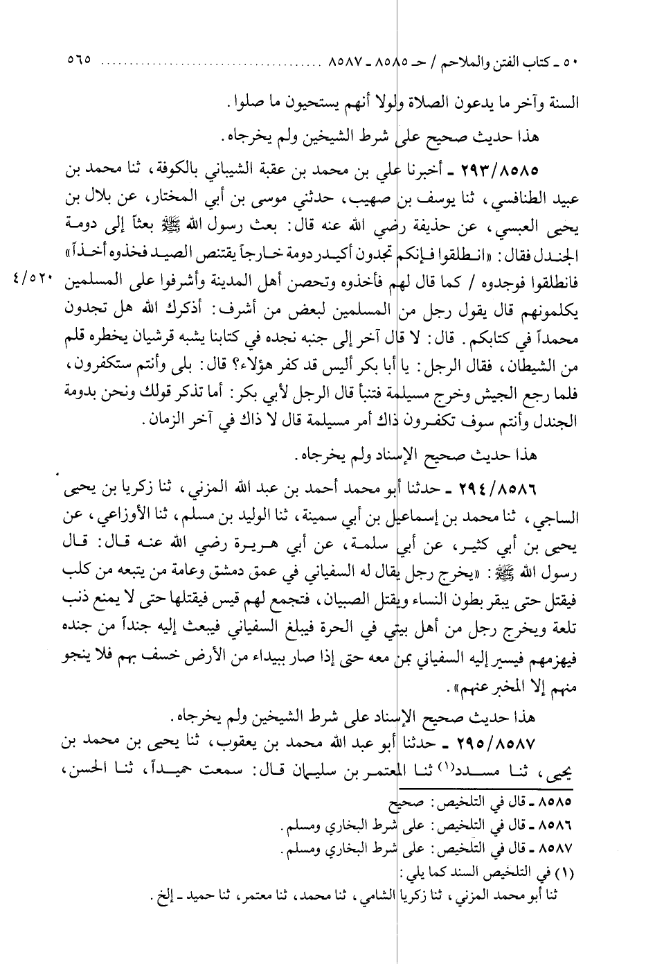 8586 - حَدَّثَنَا أَبُو مُحَمَّدٍ أَحْمَدُ بْنُ عَبْدِ اللَّهِ الْمُزَنِيُّ، ثَنَا زَكَرِيَّا بْنُ يَحْيَى السَّاجِيُّ، ثَنَا مُحَمَّدُ بْنُ إِسْمَاعِيلَ بْنِ أَبِي سَمِينَةَ، ثَنَا الْوَلِيدُ بْنُ مُسْلِمٍ، ثَنَا الْأَوْزَاعِيُّ، عَنْ يَحْيَى بْنِ أَبِي كَثِيرٍ، عَنْ أَبِي سَلَمَةَ، عَنْ أَبِي هُرَيْرَةَ رَضِيَ اللَّهُ عَنْهُ، قَالَ: قَالَ رَسُولُ اللَّهِ صَلَّى اللهُ عَلَيْهِ وَسَلَّمَ: " §يَخْرُجُ رَجُلٌ يُقَالُ لَهُ: السُّفْيَانِيُّ فِي عُمْقِ دِمَشْقَ، وَعَامَّةُ مَنْ يَتْبَعُهُ مِنْ كَلْبِ، فَيَقْتُلُ حَتَّى يَبْقَرَ بُطُونَ النِّسَاءِ، وَيَقْتُلُ الصِّبْيَانَ، فَتَجْمَعُ لَهُمْ قَيْسٌ فَيَقْتُلُهَا حَتَّى لَا يُمْنَعُ ذَنَبُ تَلْعَةٍ، وَيَخْرُجُ رَجُلٌ مِنْ أَهْلِ بَيْتِي فِي الْحَرَّةِ فَيَبْلُغُ السُّفْيَانِيَّ، فَيَبْعَثُ إِلَيْهِ جُنْدًا مِنْ جُنْدِهِ فَيَهْزِمُهُمْ، فَيَسِيرُ إِلَيْهِ السُّفْيَانِيُّ بِمَنْ مَعَهُ حَتَّى إِذَا صَارَ بِبَيْدَاءَ مِنَ الْأَرْضِ خُسِفَ بِهِمْ، فَلَا يَنْجُو مِنْهُمْ إِلَّا الْمُخْبِرُ عَنْهُمْ «هَذَا حَدِيثٌ صَحِيحُ الْإِسْنَادِ عَلَى شَرْطِ الشَّيْخَيْنِ، وَلَمْ يُخْرِجَاهُ» K8586 - على شرط البخاري ومسلم