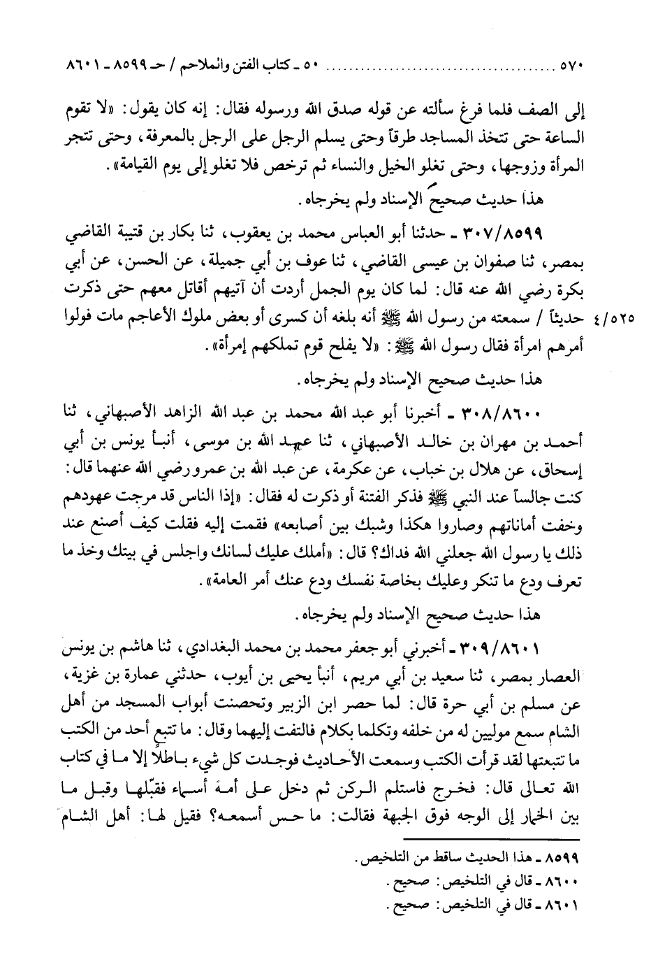 8599 - حَدَّثَنَا أَبُو الْعَبَّاسِ مُحَمَّدُ بْنُ يَعْقُوبَ، ثَنَا بَكَّارُ بْنُ قُتَيْبَةَ الْقَاضِي، بِمِصْرَ، ثَنَا صَفْوَانُ بْنُ عِيسَى الْقَاضِي، ثَنَا عَوْفُ بْنُ أَبِي جَمِيلَةَ، عَنِ الْحَسَنِ، عَنْ أَبِي بَكْرَةَ رَضِيَ اللَّهُ عَنْهُ، قَالَ: لَمَّا كَانَ يَوْمُ الْجَمَلِ أَرَدْتُ أَنْ آتِيَهُمْ أُقَاتِلُ مَعَهُمْ، حَتَّى ذَكَرْتُ حَدِيثًا سَمِعْتُهُ مِنْ رَسُولِ اللَّهِ صَلَّى اللهُ عَلَيْهِ وَسَلَّمَ أَنَّهُ بَلَغَهُ أَنَّ كِسْرَى أَوْ بَعْضَ مُلُوكِ الْأَعَاجِمِ مَاتَ فَوَلَّوْا أَمَرَهُمُ امْرَأَةً، فَقَالَ رَسُولُ اللَّهِ صَلَّى اللهُ عَلَيْهِ وَسَلَّمَ: §«لَا يُفْلِحُ قَوْمٌ تَمْلِكُهُمُ امْرَأَةٌ» هَذَا حَدِيثٌ صَحِيحُ الْإِسْنَادِ، وَلَمْ يُخْرِجَاهُ "
