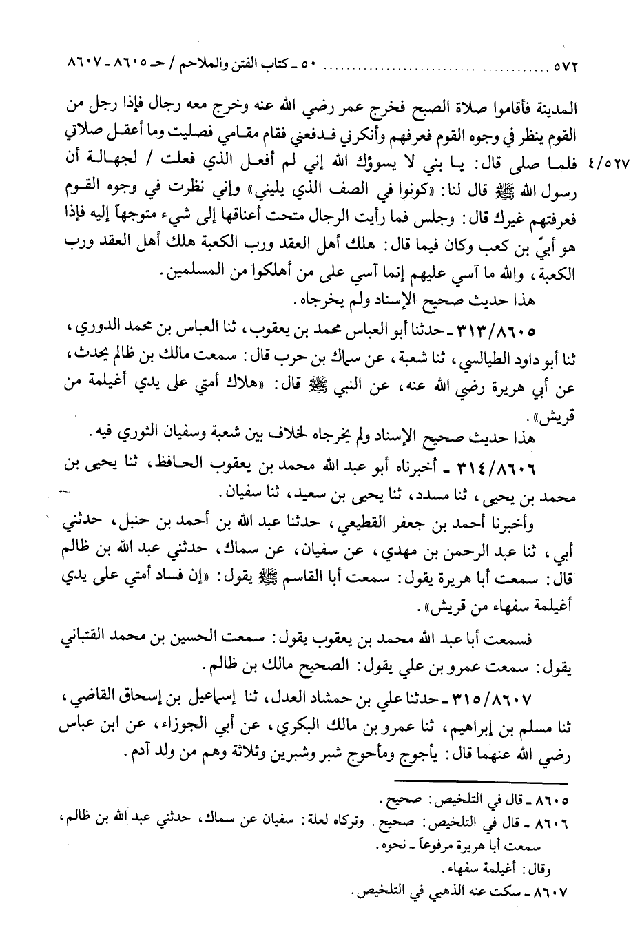 8606 - أَخْبَرْنَاهُ أَبُو عَبْدِ اللَّهِ مُحَمَّدُ بْنُ يَعْقُوبَ الْحَافِظُ، ثَنَا يَحْيَى بْنُ مُحَمَّدِ بْنِ يَحْيَى، ثَنَا مُسَدَّدٌ، ثَنَا يَحْيَى بْنُ سَعِيدٍ، ثَنَا سُفْيَانُ، وَأَخْبَرَنَا أَحْمَدُ بْنُ جَعْفَرٍ الْقَطِيعِيُّ، حَدَّثَنَا عَبْدُ اللَّهِ بْنُ أَحْمَدَ بْنِ حَنْبَلٍ، حَدَّثَنِي أَبِي، ثَنَا عَبْدُ الرَّحْمَنِ بْنُ مَهْدِيٍّ، عَنْ سُفْيَانَ، عَنْ سِمَاكٍ، حَدَّثَنِي عَبْدُ اللَّهِ بْنُ ظَالِمٍ، قَالَ: سَمِعْتُ أَبَا هُرَيْرَةَ، يَقُولُ: سَمِعْتُ أَبَا الْقَاسِمِ صَلَّى اللهُ عَلَيْهِ وَسَلَّمَ، يَقُولُ: «إِنَّ §فَسَادَ أُمَّتِي عَلَى يَدَيْ أُغَيْلِمَةٍ سُفَهَاءَ مِنْ قُرَيْشٍ» فَسَمِعْتُ أَبَا عَبْدِ اللَّهِ مُحَمَّدِ بْنِ يَعْقُوبَ، يَقُولُ: سَمِعْتُ الْحُسَيْنَ بْنَ مُحَمَّدٍ الْقَبَّانِيَّ، يَقُولُ: سَمِعْتُ عَمْرَو بْنَ عَلِيٍّ، يَقُولُ: «الصَّحِيحُ مَالِكُ بْنُ ظَالِمٍ» K8606 - صحيح