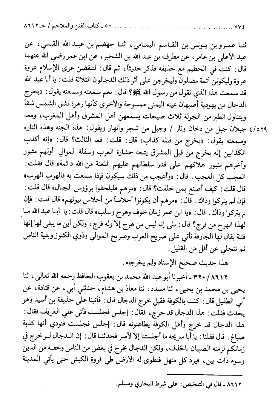 8612 - أَخْبَرَنَا أَبُو عَبْدِ اللَّهِ مُحَمَّدُ بْنُ يَعْقُوبَ الْحَافِظُ رَحِمَهُ اللَّهُ تَعَالَى، ثَنَا يَحْيَى بْنُ مُحَمَّدِ بْنِ يَحْيَى، ثَنَا مُسَدَّدٌ، ثَنَا مُعَاذُ بْنُ هِشَامٍ، حَدَّثَنِي أَبِي، عَنْ قَتَادَةَ، عَنْ أَبِي الطُّفَيْلِ، قَالَ: كُنْتُ بِالْكُوفَةِ، فَقِيلَ: خَرَجَ الدَّجَّالُ، قَالَ: فَأَتَيْنَا عَلَى حُذَيْفَةَ بْنِ أَسِيدٍ وَهُوَ يُحَدِّثُ، فَقُلْتُ: هَذَا الدَّجَّالُ قَدْ خَرَجَ، فَقَالَ: اجْلِسْ، فَجَلَسْتُ فَأَتَى عَلَيَّ الْعَرِّيفُ، فَقَالَ: هَذَا الدَّجَّالُ قَدْ خَرَجَ وَأَهْلُ الْكُوفَةِ يُطَاعِنُونَهُ، قَالَ: اجْلِسْ، فَجَلَسْتُ فَنُودِيَ إِنَّهَا كَذِبَةٌ صَبَاغٌ، قَالَ: فَقُلْنَا يَا أَبَا سَرِيحَةَ مَا أَجْلَسْتَنَا إِلَّا لِأَمْرٍ فَحَدِّثْنَا، قَالَ: " إِنَّ §الدَّجَّالَ لَوْ خَرَجَ فِي زَمَانِكُمْ لَرَمَتْهُ الصِّبْيَانُ بِالْخَذْفِ، وَلَكِنَّ الدَّجَّالَ يَخْرُجُ فِي بُغْضٍ مِنَ النَّاسِ، وَخِفَّةٍ مِنَ الدِّينِ، وَسُوءِ ذَاتِ بَيْنٍ، فَيَرِدُ كُلَّ مَنْهَلٍ، فَتُطْوَى لَهُ الْأَرْضُ طَيَّ فَرْوَةِ الْكَبْشِ حَتَّى يَأْتِيَ الْمَدِينَةَ، فَيَغْلِبُ عَلَى خَارِجِهَا وَيَمْنَعُ دَاخَلَهَا، ثُمَّ جَبَلَ إِيلِيَاءَ فَيُحَاصِرُ عِصَابَةً مِنَ الْمُسْلِمِينَ، فَيَقُولُ لَهُمُ الَّذِينَ عَلَيْهِمْ مَا تَنْتَظِرُونَ بِهَذَا الطَّاغِيَةِ أَنْ تُقَاتِلُوهُ حَتَّى تَلْحَقُوا بِاللَّهِ أَوْ يُفْتَحَ لَكُمْ، فَيَأْتَمِرُونَ أَنْ يُقَاتِلُوهُ إِذَا أَصْبَحُوا، فَيُصْبِحُونَ وَمَعَهُمْ عِيسَى ابْنُ مَرْيَمَ فَيَقْتُلُ الدَّجَّالَ وَيَهْزِمُ أَصْحَابَهُ، حَتَّى إِنَّ الشَّجَرَ وَالْحَجَرَ وَالْمَدَرَ، يَقُولُ: يَا مُؤْمِنُ هَذَا يَهُودِيٌّ عِنْدِي فَاقْتُلْهُ "، قَالَ: " وَفِيهِ ثَلَاثُ عَلَامَاتٍ: هُوَ أَعْوَرُ وَرَبُّكُمْ لَيْسَ بِأَعْوَرَ، وَمَكْتُوبٌ بَيْنَ عَيْنَيْهِ كَافِرٌ يَقْرَأُهُ كُلُّ مُؤْمِنٍ أُمِّيٌّ وَكَاتِبٌ، وَلَا يُسَخَّرُ لَهُ مِنَ الْمَطَايَا إِلَّا الْحِمَارُ، فَهُوَ رِجْسٌ عَلَى رِجْسٍ، ثُمَّ قَالَ: أَنَا لِغَيْرِ الدَّجَّالِ أَخْوَفُ عَلَيَّ وَعَلَيْكُمْ "، قَالَ: فَقُلْنَا: مَا هُوَ يَا أَبَا سَرِيحَةَ؟ قَالَ: «فِتَنٌ كَأَنَّهَا قِطَعُ اللَّيْلِ الْمُظْلِمِ» ، قَالَ: فَقُلْنَا: أَيُّ النَّاسِ فِيهَا شَرٌّ؟ قَالَ: «كُلُّ خَطِيبٍ مُصْقِعٍ، وَكُلُّ رَاكِبٍ مُوضِعٍ» ، قَالَ: فَقُلْنَا: أَيُّ النَّاسِ فِيهَا خَيْرٌ؟ قَالَ: «كُلُّ غَنِيٍّ خَفِيٍّ» ، قَالَ: فَقُلْتُ: مَا أَنَا بِالْغَنِيِّ وَلَا بِالْخَفِيِّ، قَالَ: «فَكُنْ كَابْنِ اللَّبُونِ لَا ظَهْرَ فَيُرْكَبَ، وَلَا ضَرْعَ فَيُحْلَبَ» هَذَا حَدِيثٌ صَحِيحُ الْإِسْنَادِ، وَلَمْ يُخَرِّجَاهُ "K8612 - على شرط البخاري ومسلم