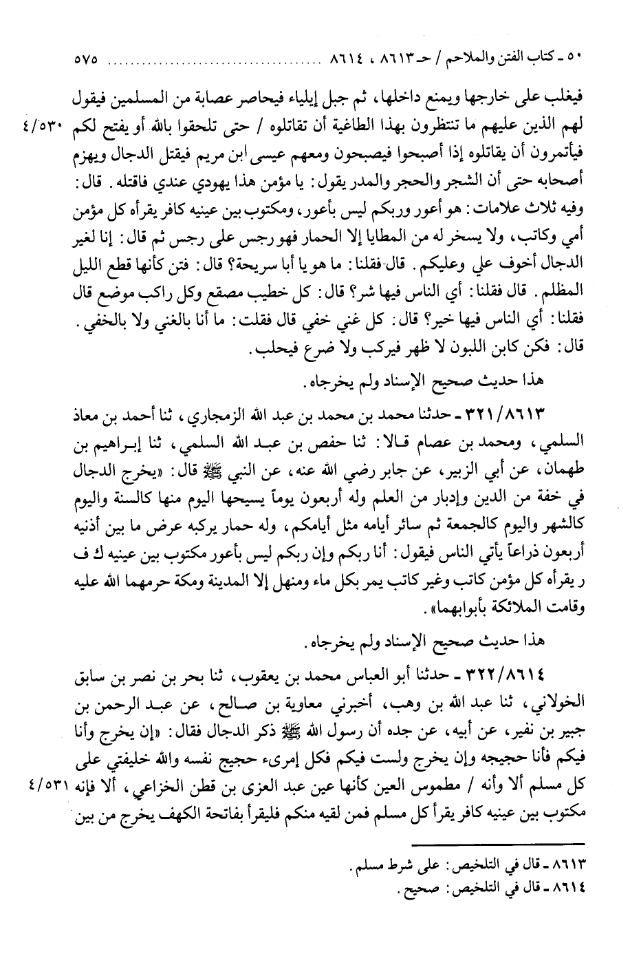 8614 - حَدَّثَنَا أَبُو الْعَبَّاسِ مُحَمَّدُ بْنُ يَعْقُوبَ، ثَنَا بَحْرُ بْنُ نَصْرِ بْنِ سَابِقٍ الْخَوْلَانِيُّ، ثَنَا عَبْدُ اللَّهِ بْنُ وَهْبٍ، أَخْبَرَنِي مُعَاوِيَةُ بْنُ صَالِحٍ، عَنْ عَبْدِ الرَّحْمَنِ بْنِ جُبَيْرِ بْنِ نُفَيْرٍ، عَنْ أَبِيهِ، عَنْ جَدِّهِ، أَنَّ رَسُولَ اللَّهِ صَلَّى اللهُ عَلَيْهِ وَسَلَّمَ ذَكَرَ الدَّجَّالَ، فَقَالَ: §«إِنْ يَخْرُجْ وَأَنَا فِيكُمْ فَأَنَا حَجِيجُهُ، وَإِنْ يَخْرُجْ وَلَسْتُ فِيكُمْ فَكُلُّ امْرِئٍ حَجِيجُ نَفْسِهِ، وَاللَّهُ خَلِيفَتِي عَلَى كُلِّ مُسْلِمٍ، أَلَا وَإِنَّهُ مَطْمُوسُ الْعَيْنِ كَأَنَّهَا عَيْنُ عَبْدِ الْعُزَّى بْنِ قَطَنٍ الْخُزَاعِيِّ، أَلَا فَإِنَّهُ مَكْتُوبٌ بَيْنَ عَيْنَيْهِ كَافِرٌ يَقْرَأُ كُلُّ مُسْلِمٍ، فَمَنْ لَقِيَهُ مِنْكُمْ فَلْيَقْرَأْ بِفَاتِحَةِ الْكَهْفِ، يَخْرُجُ مِنْ بَيْنِ الشَّامِ وَالْعِرَاقِ، فَعَاثَ يَمِينًا وَعَاثَ شِمَالًا، يَا عِبَادَ اللَّهِ اثْبُتُوا» ثَلَاثًا، فَقِيلَ: يَا رَسُولَ اللَّهِ فَمَا مُكْثُهُ فِي الْأَرْضِ؟ قَالَ: " أَرْبَعُونَ يَوْمًا: يَوْمٌ كَالسَّنَةِ، وَيَوْمٌ كَالشَّهْرِ، وَيَوْمٌ كَالْجُمُعَةِ، وَسَائِرُ أَيَّامِهِ كَأَيَّامِكُمْ " قَالُوا: يَا رَسُولَ اللَّهِ فَكَيْفَ نَصْنَعُ بِالصَّلَاةِ يَوْمَئِذٍ صَلَاةُ يَوْمٍ أَوْ نَقْدُرُ؟ قَالَ: «بَلْ تَقْدُرُوا» هَذَا حَدِيثٌ صَحِيحُ الْإِسْنَادِ، وَلَمْ يُخْرِجَاهُ "K8614 - صحيح