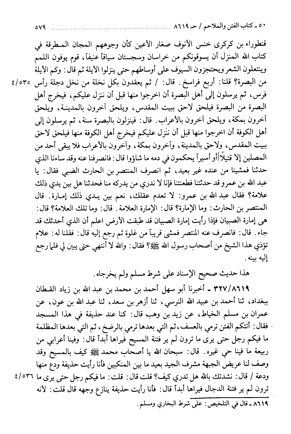 8619 - أَخْبَرَنَا أَبُو سَهْلٍ أَحْمَدُ بْنُ مُحَمَّدِ بْنِ عَبْدِ اللَّهِ بْنِ زِيَادٍ الْقَطَّانُ بِبَغْدَادَ، ثَنَا أَحْمَدُ بْنُ عُبَيْدِ اللَّهِ النَّرْسِيُّ، ثَنَا أَزْهَرُ بْنُ سَعْدٍ، ثَنَا عَبْدُ اللَّهِ بْنُ عَوْنٍ، عَنْ عِمْرَانَ بْنِ مُسْلِمٍ الْخَيَّاطِ، عَنْ زَيْدِ بْنِ وَهْبٍ، قَالَ: كُنَّا عِنْدَ حُذَيْفَةَ فِي هَذَا الْمَسْجِدِ، فَقَالَ: «§أَتَتْكُمُ الْفِتَنُ تَرْمِي بِالْعَسْفِ، ثُمَّ الَّتِي بَعْدَهَا تَرْمِي بِالرَّضْخِ، ثُمَّ الَّتِي بَعْدَهَا الْمُظْلِمَةُ مَا فِيكُمْ رَجُلٌ حَتَّى يَرَى مَا تَرَوْنَ، لَمْ يَرَ فِتْنَةَ الْمَسِيحِ فَيَرَاهَا أَبَدًا» ، قَالَ: وَفِينَا أَعْرَابِيٌّ مِنْ رَبِيعَةَ مَا فِينَا حَيٌّ غَيْرُهُ، قَالَ: سُبْحَانَ اللَّهِ يَا أَصْحَابَ مُحَمَّدٍ صَلَّى اللهُ عَلَيْهِ وَسَلَّمَ، كَيْفَ بِالْمَسِيحِ وَقَدْ وُصَفَ لَنَا عَرِيضُ الْجَبْهَةِ مُشْرِفُ الْجِيدِ، بَعِيدٌ مَا بَيْنَ الْمَنْكِبَيْنِ، فَأَنَا رَأَيْتُ حُذَيْفَةَ وَدَعَ مِنْهَا وَدَعَةً، قَالَ: نَشَدْتُكَ بِاللَّهِ هَلْ تَدْرِي كَيْفَ قُلْتُ؟ قَالَ: قُلْتَ: «مَا فِيكُمْ رَجُلٌ حَتَّى يَرَى مَا تَرَوْنَ، لَمْ يَرَ فِتْنَةَ الدَّجَّالِ فَيَرَاهَا أَبَدًا» ، قَالَ: فَأَنَا رَأَيْتُ حُذَيْفَةَ يُنَازِعُ وَجْهَهُ، قَالَ: قُلْتُ: لِأَنَّهُ حَفِظَ الْحَدِيثَ عَلَى وَجْهِهِ؟ قَالَ: نَعَمْ، قَالَ: ثُمَّ قَالَ كَلِمَةً ضَعِيفَةً: «أَرَأَيْتُمْ يَوْمَ الدَّارِ أَمْسِ فَإِنَّهَا كَانَتْ فِتْنَةً عَامَّةً عَمَّتِ النَّاسَ» ، قَالَ: وَفِينَا أَعْرَابِيٌّ مِنْ رَبِيعَةَ مَا فِينَا حَيٌّ غَيْرُهُ، قَالَ: سُبْحَانَ اللَّهِ يَا أَصْحَابَ مُحَمَّدٍ فَأَيْنَ الَّذِينَ يَنعَقُونَ لِقَاحَنَا، وَيَنْقُبُونَ بُيُوتَنَا؟ قَالَ: «أُولَئِكَ هُمُ الْفَاسِقُونَ» - مَرَّتَيْنِ - قَالَ: «وَلَقَدْ خَرَجْتُ يَوْمَ الْجَرَعَةِ وَلَقَدْ عَلِمْتُ أَنَّهُ لَمْ يُهَرَاقَ فِيهَا مِحْجَمَةٌ مِنْ دَمٍ، وَمَا نَهَيْتُ عَنْهَا إِلَّا ابْنَ الْحِصْرَامَةِ» وَفِينَا أَعْرَابِيٌّ مِنْ رَبِيعَةَ مَا فِينَا حَيٌّ غَيْرُهُ، قَالَ: سُبْحَانَ اللَّهِ يَا أَصْحَابَ مُحَمَّدٍ صَلَّى اللهُ عَلَيْهِ وَسَلَّمَ ابْنُ الْحِصْرَامَةِ دُونَ النَّاسِ، فَقَالَ: «إِنَّهَا إِذَا أَقْبَلَتْ كَانَتْ لِلْقَائِمِ وَالْقَائِلِ، وَإِنَّ ابْنَ الْحِصْرَامَةِ رَجُلٌ قَوَّالَةٌ» هَذَا حَدِيثٌ صَحِيحُ الْإِسْنَادِ عَلَى شَرْطِ الشَّيْخَيْنِ، فَقَدِ احْتَجَّا بِعِمْرَانَ بْنِ مُسْلِمٍ، وَلَمْ يُخْرِجَاهُ "K8619 - على شرط البخاري ومسلم