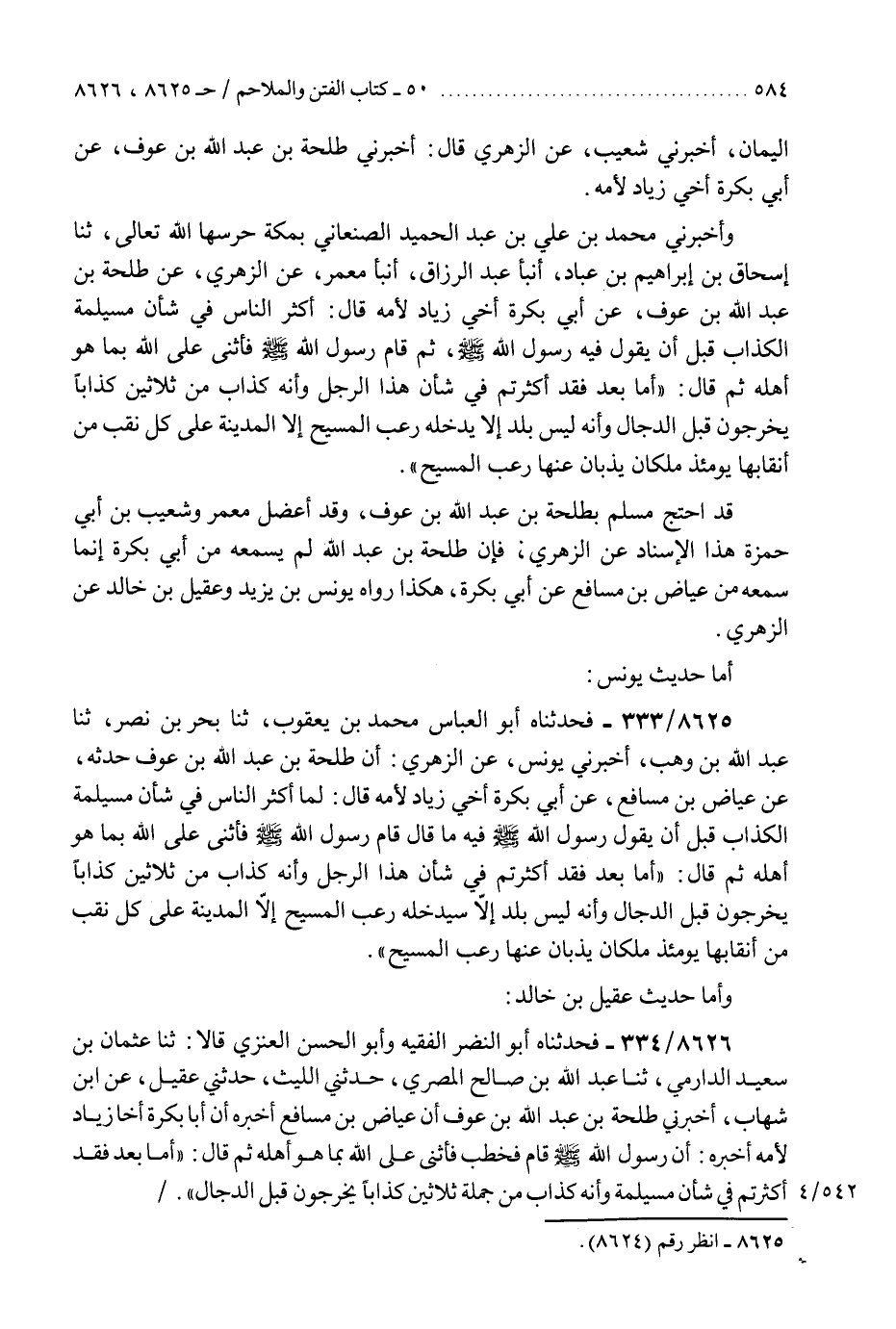 8625 - فَحَدَّثْنَاهُ أَبُو الْعَبَّاسِ مُحَمَّدُ بْنُ يَعْقُوبَ، ثَنَا بَحْرُ بْنُ نَصْرٍ، ثَنَا عَبْدُ اللَّهِ بْنُ وَهْبٍ، أَخْبَرَنِي يُونُسُ، عَنِ الزُّهْرِيِّ، أَنَّ طَلْحَةَ بْنَ عَبْدِ اللَّهِ بْنِ عَوْفٍ حَدَّثَهُ، عَنْ عِيَاضِ بْنِ مُسَافِعٍ، عَنْ أَبِي بَكْرَةَ، أَخِي زِيَادٍ لِأُمِّهِ، قَالَ: لَمَّا أَكْثَرَ النَّاسُ فِي شَأْنِ مُسَيْلِمَةَ الْكَذَّابِ قَبْلَ أَنْ يَقُولَ رَسُولُ اللَّهِ صَلَّى اللهُ عَلَيْهِ وَسَلَّمَ فِيهِ مَا قَالَ، قَامَ رَسُولُ اللَّهِ صَلَّى اللهُ عَلَيْهِ وَسَلَّمَ فَأَثْنَى عَلَى اللَّهِ بِمَا هُوَ أَهْلُهُ ثُمَّ قَالَ: «أَمَّا بَعْدُ §فَقَدْ أَكْثَرْتُمْ فِي شَأْنِ هَذَا الرَّجُلِ، وَإِنَّهُ كَذَّابٌ مَنْ ثَلَاثِينَ كَذَّابًا يَخْرُجُونَ قَبْلَ الدَّجَّالِ، وَإِنَّهُ لَيْسَ بَلَدٌ إِلَّا سَيَدْخُلُهُ رُعْبُ الْمَسِيحِ إِلَّا الْمَدِينَةَ عَلَى كُلِّ نَقْبٍ مَنْ أَنْقَابِهَا يَوْمَئِذٍ مَلَكَانِ يَذُبَّانِ عَنْهَا رُعْبَ الْمَسِيحِ»