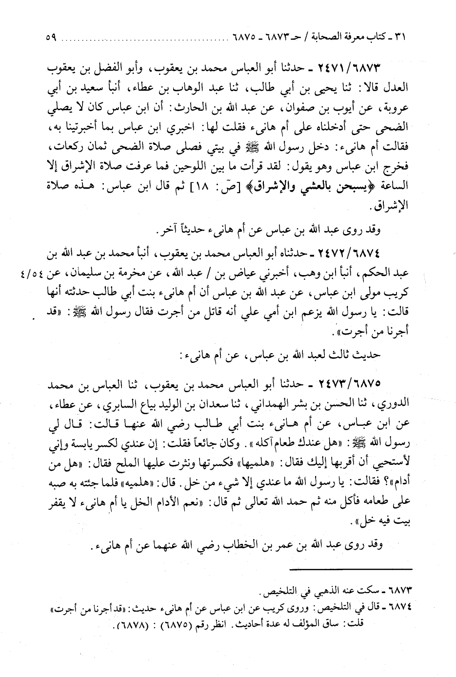 6873 - حَدَّثَنَا أَبُو الْعَبَّاسِ مُحَمَّدُ بْنُ يَعْقُوبَ، وَأَبُو الْفَضْلِ بْنُ يَعْقُوبَ الْعَدْلُ، قَالَا: ثَنَا يَحْيَى بْنُ أَبِي طَالِبٍ، ثَنَا عَبْدُ الْوَهَّابِ بْنِ عَطَاءٍ، أنبأ سَعِيدُ بْنُ أَبِي عَرُوبَةَ، عَنْ أَيُّوبَ بْنِ صَفْوَانَ، عَنْ عَبْدِ اللَّهِ بْنِ الْحَارِثِ، أَنَّ ابْنَ عَبَّاسٍ كَانَ لَا يُصَلِّي الضُّحَى حَتَّى أَدْخَلَنَاهُ عَلَى أُمِّ هَانِئٍ فَقُلْتُ لَهَا: أَخْبِرِي ابْنَ عَبَّاسٍ بِمَا أَخْبَرْتِينَا بِهِ، فَقَالَتْ أُمُّ هَانِئٍ: «دَخَلَ رَسُولُ اللَّهِ صَلَّى اللهُ عَلَيْهِ وَسَلَّمَ فِي بَيْتِي §فَصَلَّى صَلَاةَ الضُّحَى ثَمَانِ رَكَعَاتٍ» فَخَرَجَ ابْنُ عَبَّاسٍ، وَهُوَ يَقُولُ: «لَقَدْ قَرَأْتُ مَا بَيْنَ اللَّوْحَيْنِ فَمَا عَرَفْتُ صَلَاةَ الْإِشْرَاقِ إِلَّا السَّاعَةَ» {يُسَبِّحْنَ بِالْعَشِيِّ وَالْإِشْرَاقِ} [ص: 18] ، ثُمَّ قَالَ ابْنُ عَبَّاسٍ: «هَذِهِ صَلَاةُ الْإِشْرَاقِ» وَقَدْ رَوَى عَبْدُ اللَّهِ بْنُ عَبَّاسٍ عَنْ أُمِّ هَانِئٍ حَدِيثًا آخَرَ "K6873 - سكت عنه الذهبي في التلخيص
