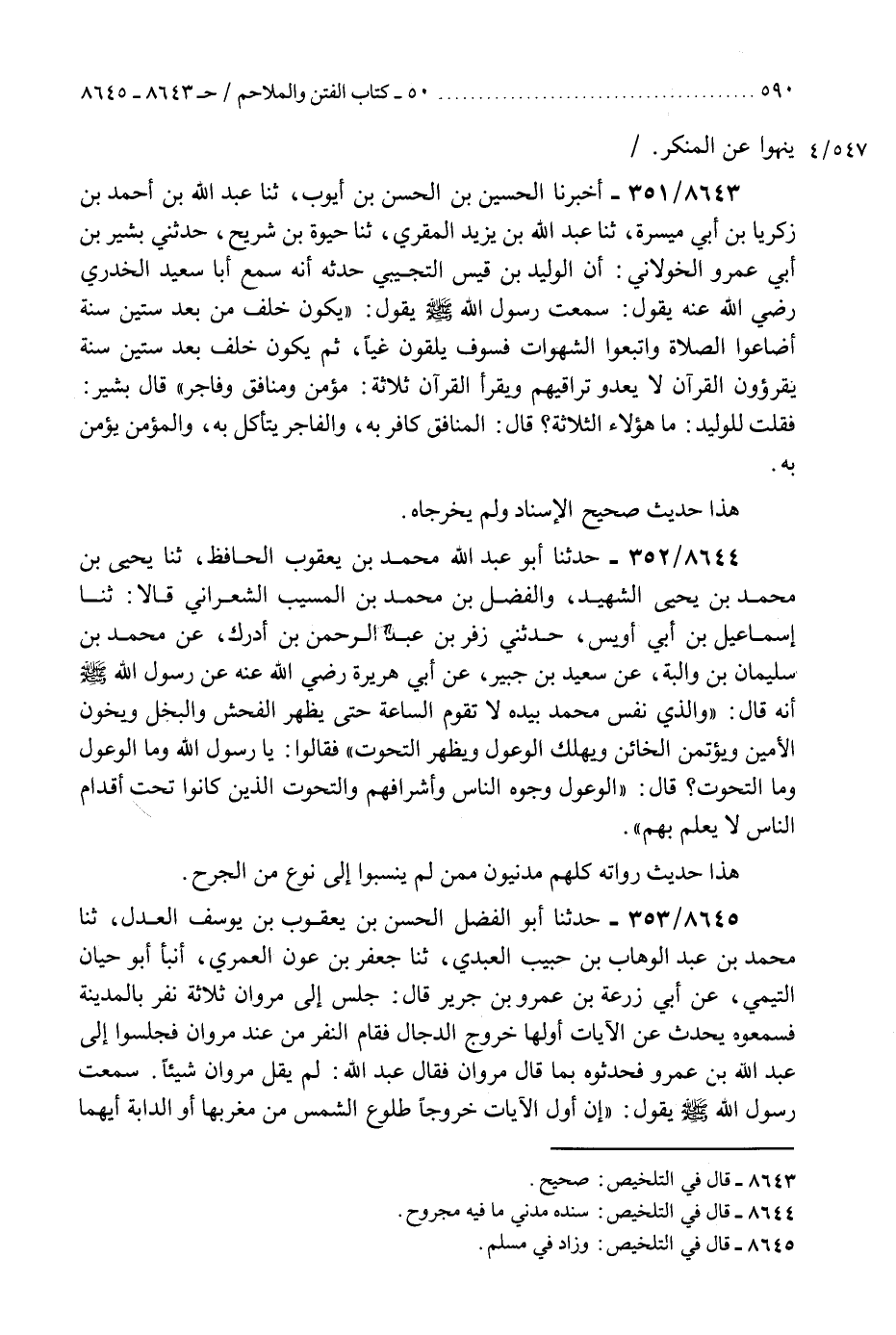 8643 - أَخْبَرَنَا الْحُسَيْنُ بْنُ الْحَسَنِ بْنِ أَيُّوبَ، ثَنَا عَبْدُ اللَّهِ بْنُ أَحْمَدَ بْنِ زَكَرِيَّا بْنِ أَبِي مَسَرَّةَ، ثَنَا عَبْدُ اللَّهِ بْنُ يَزِيدَ الْمُقْرِئُ، ثَنَا حَيْوَةُ بْنُ شُرَيْحٍ، حَدَّثَنِي بَشِيرُ بْنُ أَبِي عَمْرٍو الْخَوْلَانِيُّ، أَنَّ الْوَلِيدَ بْنَ قَيْسٍ التُّجِيبِيَّ، حَدَّثَهُ أَنَّهُ سَمِعَ أَبَا سَعِيدٍ الْخُدْرِيَّ رَضِيَ اللَّهُ عَنْهُ، يَقُولُ: سَمِعْتُ رَسُولَ اللَّهِ صَلَّى اللهُ عَلَيْهِ وَسَلَّمَ، يَقُولُ: «§يَكُونُ خَلْفٌ مِنْ بَعْدِ سِتِّينَ سَنَةً أَضَاعُوا الصَّلَاةَ، وَاتَّبَعُوا الشَّهَوَاتِ فَسَوْفَ يَلْقَوْنَ غَيًّا، ثُمَّ يَكُونُ خَلْفٌ بَعْدَ سِتِّينَ سَنَةً يَقْرَأُونَ الْقُرْآنَ لَا يَعْدُو تَرَاقِيَهُمْ، وَيَقْرَأُ الْقُرْآنَ ثَلَاثَةٌ مُؤْمِنٌ وَمُنَافِقٌ وَفَاجِرٌ» قَالَ بَشِيرٌ: فَقُلْتُ لِلْوَلِيدِ: مَا هَؤُلَاءِ الثَّلَاثَةُ؟ قَالَ: «الْمُنَافِقُ كَافِرٌ بِهِ، وَالْفَاجِرُ يَتَأَكَّلُ بِهِ، وَالْمُؤْمِنُ يُؤْمِنُ بِهِ» هَذَا حَدِيثٌ صَحِيحُ الْإِسْنَادِ، وَلَمْ يُخْرِجَاهُ "K8643 - صحيح