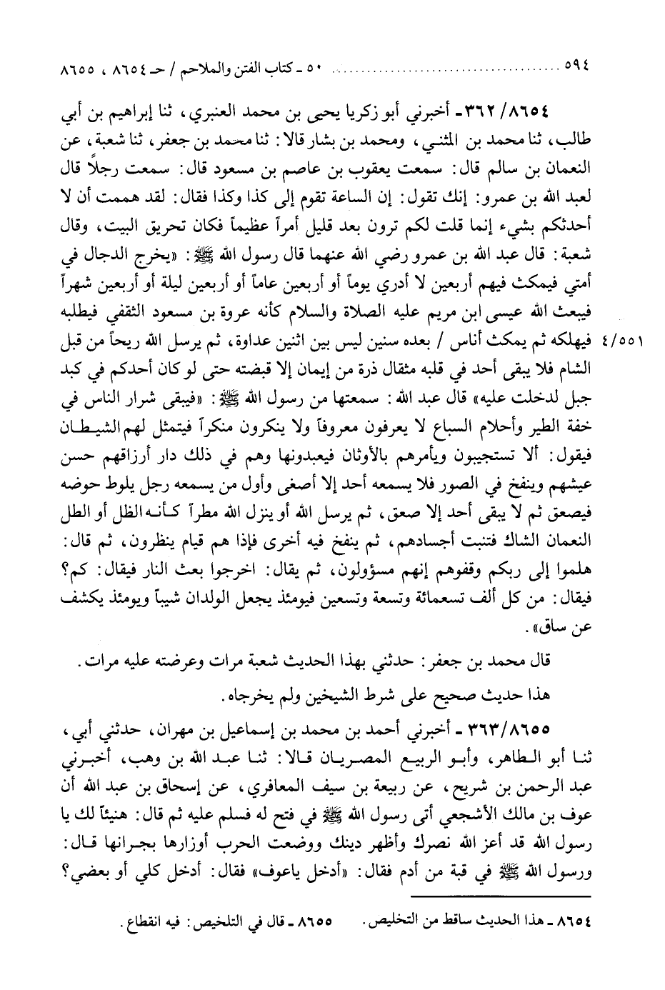 8654 - أَخْبَرَنِي أَبُو زَكَرِيَّا يَحْيَى بْنُ مُحَمَّدٍ الْعَنْبَرِيُّ، ثَنَا إِبْرَاهِيمُ بْنُ أَبِي طَالِبٍ، ثَنَا مُحَمَّدُ بْنُ الْمُثَنَّى، وَمُحَمَّدُ بْنُ بَشَّارٍ، قَالَا: ثَنَا مُحَمَّدُ بْنُ جَعْفَرٍ، ثَنَا شُعْبَةُ، عَنِ النُّعْمَانِ بْنِ سَالِمٍ، قَالَ: سَمِعْتُ يَعْقُوبَ بْنَ عَاصِمِ بْنِ مَسْعُودٍ، قَالَ: سَمِعْتُ رَجُلًا قَالَ لِعَبْدِ اللَّهِ بْنِ عَمْرٍو: إِنَّكَ تَقُولُ إِنَّ السَّاعَةَ تَقُومُ إِلَى كَذَا وَكَذَا، فَقَالَ: لَقَدْ هَمَمْتُ أَنْ لَا أُحَدِّثَكُمْ بِشَيْءٍ، إِنَّمَا قُلْتُ لَكُمْ تَرَوْنَ بَعْدَ قَلِيلٍ أَمْرًا عَظِيمًا فَكَانَ تَحْرِيقُ الْبَيْتِ. وَقَالَ شُعْبَةُ، قَالَ عَبْدُ اللَّهِ بْنُ عَمْرٍو رَضِيَ اللَّهُ عَنْهُمَا: قَالَ رَسُولُ اللَّهِ صَلَّى اللهُ عَلَيْهِ وَسَلَّمَ: §«يَخْرُجُ الدَّجَّالُ فِي أُمَّتِي فَيَمْكُثُ فِيهِمْ أَرْبَعِينَ» لَا أَدْرِي يَوْمًا أَوْ أَرْبَعِينَ عَامًا أَوْ أَرْبَعِينَ لَيْلَةً أَوْ أَرْبَعِينَ شَهْرًا «فَيَبْعَثُ اللَّهُ عِيسَى ابْنَ مَرْيَمَ عَلَيْهِ الصَّلَاةُ وَالسَّلَامُ كَأَنَّهُ عُرْوَةُ بْنُ مَسْعُودٍ الثَّقَفِيُّ فَيَطْلُبُهُ فَيُهْلِكُهُ، ثُمَّ يَمْكُثُ أُنَاسٌ بَعْدَهُ سِنِينَ لَيْسَ بَيْنَ اثْنَيْنِ عَدَاوَةٌ، ثُمَّ يُرْسِلُ اللَّهُ رِيحًا مِنْ قِبَلِ الشَّامِ فَلَا يَبْقَى أَحَدٌ فِي قَلْبِهِ مِثْقَالُ ذَرَّةٍ مِنْ إِيمَانٍ، إِلَّا قَبْضَتْهُ حَتَّى لَوْ كَانَ أَحَدُكُمْ فِي كَبِدِ جَبَلٍ لَدَخَلَتْ عَلَيْهِ» قَالَ عَبْدُ اللَّهِ: سَمِعْتُهَا مِنْ رَسُولِ اللَّهِ صَلَّى اللهُ عَلَيْهِ وَسَلَّمَ: " فَيَبْقَى شِرَارُ النَّاسِ فِي خِفَّةِ الطَّيْرِ، وَأَحْلَامِ السِّبَاعِ لَا يَعْرِفُونَ مَعْرُوفًا، وَلَا يُنْكِرُونَ مُنْكَرًا، فَيَتَمَثَّلُ لَهُمُ الشَّيْطَانُ فَيَقُولُ: أَلَا تَسْتَجِيبُونَ وَيَأْمُرُهُمْ بِالْأَوْثَانِ فَيَعْبُدُونَهَا وَهُمْ فِي ذَلِكَ دَارٌّ أَرْزَاقُهُمْ حَسَنٌ عَيْشُهُمْ، وَيُنْفَخُ فِي الصُّورِ فَلَا يَسْمَعُهُ أَحَدٌ إِلَّا أَصْغَى، وَأَوَّلُ مَنْ يَسْمَعُهُ رَجُلٌ يَلُوطُ حَوْضَهُ فَيَصْعَقُ، ثُمَّ لَا يَبْقَى أَحَدٌ إِلَّا صَعِقَ، ثُمَّ يُرْسِلُ اللَّهُ - أَوْ يُنْزِلُ اللَّهُ - مَطَرًا كَأَنَّهُ الظِّلُّ - أَوِ الطَّلُّ النُّعْمَانُ الشَّاكُّ - فَتَنْبُتُ أَجْسَادُهُمْ، ثُمَّ يُنْفَخُ فِيهِ أُخْرَى فَإِذَا هُمْ قِيَامٌ يَنْظُرُونَ " ثُمَّ قَالَ: " هَلُمُّوا إِلَى رَبِّكُمْ وَقِفُوهُمْ إِنَّهُمْ مَسْئُولُونَ، ثُمَّ يُقَالُ: أَخْرِجُوا بَعْثَ النَّارِ فَيُقَالُ: كَمْ؟ فَيُقَالُ: مِنْ كُلِّ أَلْفٍ تِسْعَمِائَةٌ وَتِسْعَةٌ وَتِسْعِينَ، فَيَوْمَئِذٍ يَجْعَلُ الْوِلْدَانَ شِيبًا، وَيَوْمَئِذٍ يُكْشَفُ عَنْ سَاقٍ " قَالَ مُحَمَّدُ بْنُ جَعْفَرٍ: حَدَّثَنِي بِهَذَا الْحَدِيثِ شُعْبَةُ مَرَّاتٍ وَعَرَضْتُهُ عَلَيْهِ مَرَّاتٍ، «حَدِيثٌ صَحِيحٌ عَلَى شَرْطِ الشَّيْخَيْنِ، وَلَمْ يُخْرِجَاهُ»