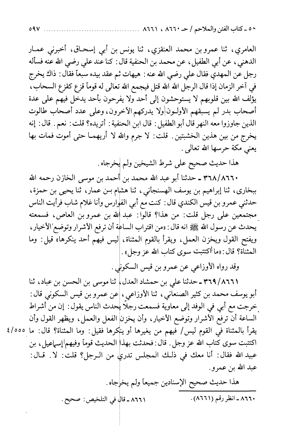 8661 - حَدَّثَنَا عَلِيُّ بْنُ حَمْشَاذَ الْعَدْلُ، ثَنَا مُوسَى بْنُ الْحَسَنِ بْنِ عَبَّادٍ، ثَنَا أَبُو يُوسُفَ مُحَمَّدُ بْنُ كَثِيرٍ الصَّنْعَانِيُّ، ثَنَا الْأَوْزَاعِيُّ، عَنْ عَمْرِو بْنِ قَيْسٍ السَّكُونِيِّ، قَالَ: خَرَجْتُ مَعَ أَبِي فِي الْوَفْدِ إِلَى مُعَاوِيَةَ فَسَمِعْتُ رَجُلًا يُحَدِّثُ النَّاسَ، يَقُولُ: «إِنَّ §مِنْ أَشْرَاطِ السَّاعَةِ أَنْ تُرْفَعَ الْأَشْرَارُ وَتُوضَعَ الْأَخْيَارُ، وَأَنْ يُخْزَنَ الْفِعْلُ وَالْعَمَلُ وَيَظْهَرَ الْقَوْلُ، وَأَنْ يُقْرَأَ بِالْمُثَنَّاةِ فِي الْقَوْمِ لَيْسَ فِيهِمْ مَنْ يُغَيِّرُهَا أَوْ يُنْكِرُهَا» فَقِيلَ: وَمَا الْمُثَنَّاةُ؟ قَالَ: «مَا اكْتُتِبَتْ سِوَى كِتَابِ اللَّهِ عَزَّ وَجَلَّ» قَالَ: فَحَدَّثْتُ بِهَذَا الْحَدِيثِ قَوْمًا وَفِيهِمْ إِسْمَاعِيلُ بْنُ عُبَيْدِ اللَّهِ، فَقَالَ: أَنَا مَعَكَ فِي ذَلِكَ الْمَجْلِسِ تَدْرِي مَنِ الرَّجُلُ؟ قُلْتُ: لَا، قَالَ: عَبْدُ اللَّهِ بْنُ عَمْرٍو «هَذَا حَدِيثٌ صَحِيحُ الْإِسْنَادَيْنِ جَمِيعًا، وَلَمْ يُخْرِجَاهُ» K8661 - صحيح