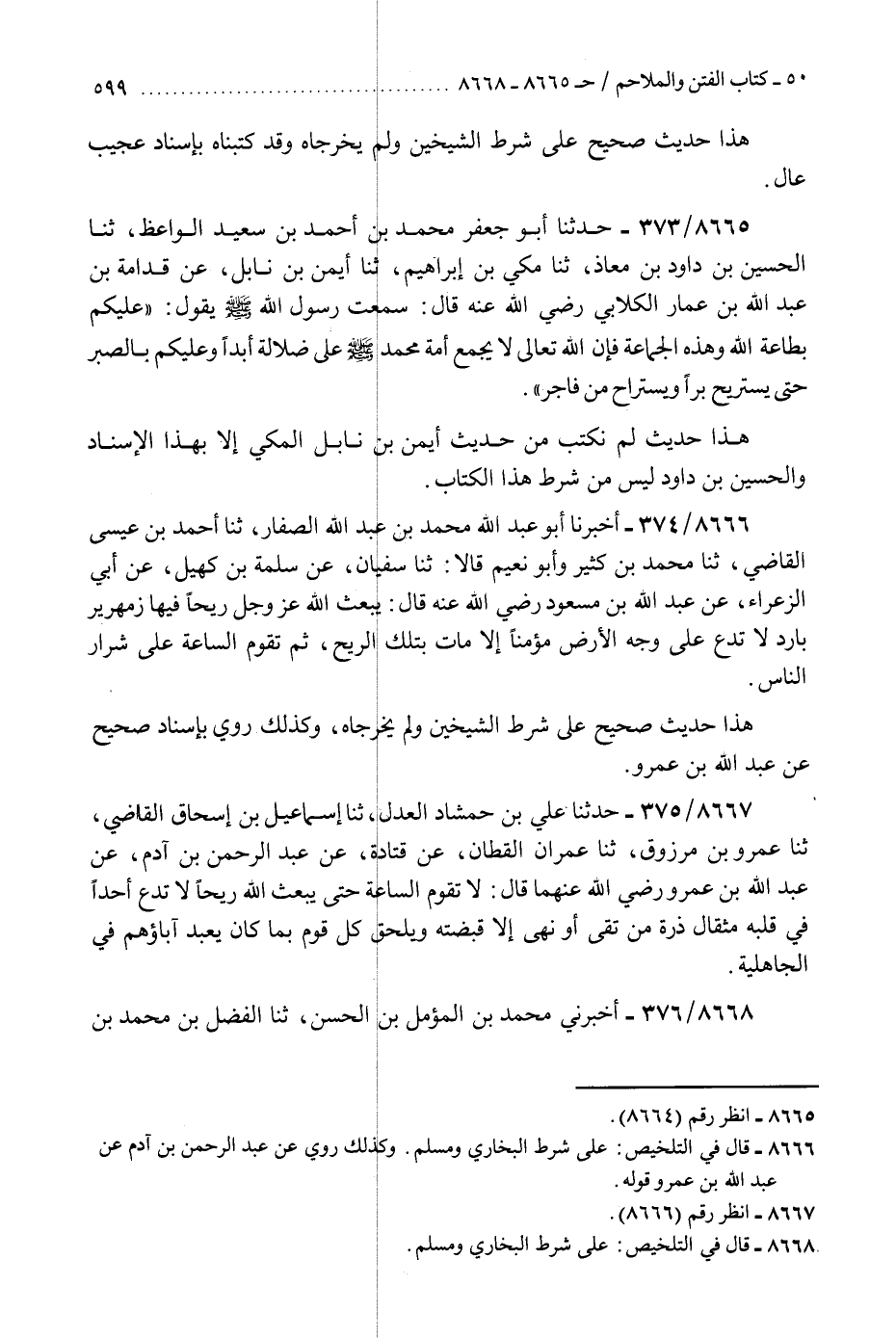 8666 - أَخْبَرَنَا أَبُو عَبْدِ اللَّهِ مُحَمَّدُ بْنُ عَبْدِ اللَّهِ الصَّفَّارُ، ثَنَا أَحْمَدُ بْنُ عِيسَى الْقَاضِي، ثَنَا مُحَمَّدُ بْنُ كَثِيرٍ، وَأَبُو نُعَيْمٍ قَالَا: ثَنَا سُفْيَانُ، عَنْ سَلَمَةَ بْنِ كُهَيْلٍ، عَنْ أَبِي الزَّعْرَاءِ، عَنْ عَبْدِ اللَّهِ بْنِ مَسْعُودٍ رَضِيَ اللَّهُ عَنْهُ، قَالَ: «§يَبْعَثُ اللَّهُ عَزَّ وَجَلَّ رِيحًا فِيهَا زَمْهَرِيرٌ بَارِدٌ، لَا تَدَعُ عَلَى وَجْهِ الْأَرْضِ مُؤْمِنًا إِلَّا مَاتَ بِتِلْكَ الرِّيحِ، ثُمَّ تَقُومُ السَّاعَةُ عَلَى شِرَارِ النَّاسِ» هَذَا حَدِيثٌ صَحِيحٌ عَلَى شَرْطِ الشَّيْخَيْنِ، وَلَمْ يُخْرِجَاهُ "، وَكَذَلِكَ رُوِيَ بِإِسْنَادٍ صَحِيحٍ، عَنْ عَبْدِ اللَّهِ بْنِ عَمْرٍوK8666 - على شرط البخاري ومسلم