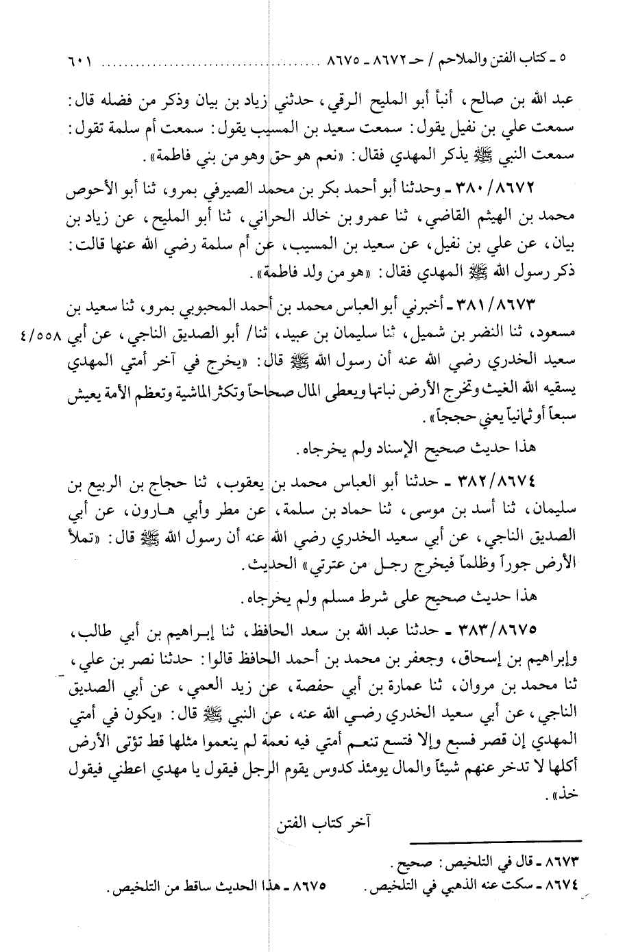 8675 - حَدَّثَنَا عَبْدُ اللَّهِ بْنُ سَعْدٍ الْحَافِظُ، ثَنَا إِبْرَاهِيمُ بْنُ أَبِي طَالِبٍ، وَإِبْرَاهِيمُ بْنُ إِسْحَاقَ، وَجَعْفَرُ بْنُ مُحَمَّدِ بْنِ أَحْمَدَ الْحَافِظُ، قَالُوا: حَدَّثَنَا نَصْرُ بْنُ عَلِيٍّ، ثَنَا مُحَمَّدُ بْنُ مَرْوَانَ، ثَنَا عُمَارَةُ بْنُ أَبِي حَفْصَةَ، عَنْ زَيْدٍ الْعَمِّيِّ، عَنْ أَبِي الصِّدِّيقِ النَّاجِيِّ، عَنْ أَبِي سَعِيدٍ الْخُدْرِيِّ رَضِيَ اللَّهُ عَنْهُ، عَنِ النَّبِيِّ صَلَّى اللهُ عَلَيْهِ وَسَلَّمَ، قَالَ: " §يَكُونُ فِي أُمَّتِي الْمَهْدِيُّ إِنْ قَصَّرَ فَسَبْعٌ وَإِلَّا فَتِسْعٌ، تَنْعَمُ أُمَّتِي فِيهِ نِعْمَةً لَمْ يَنْعَمُوا مِثْلَهَا قَطُّ، تُؤْتِي الْأَرْضُ أُكُلَهَا لَا تَدَّخِرُ عَنْهُمْ شَيْئًا، وَالْمَالُ يَوْمَئِذٍ كُدُوسٌ يَقُومُ الرَّجُلُ فَيَقُولُ: يَا مَهْدِيُّ أَعْطِنِي، فَيَقُولُ: خُذْ " قَالَ الْحَاكِمُ رَحِمَهُ اللَّهُ تَعَالَى: «قَدْ رَوَيْتُ مَا انْتَهَى إِلَيْهِ عِلْمِي مِنْ فِتَنِ آخِرِ الزَّمَانِ عَلَى لِسَانِ الْمُصْطَفَى صَلَّى اللهُ عَلَيْهِ وَسَلَّمَ بِالْأَسَانِيدِ اللَّائِقَةِ بِهَذَا الْكِتَابِ، فَأَمَّا الشَّيْخَانِ رَضِيَ اللَّهُ عَنْهُمَا فَإِنَّهُمَا ذَكَرَا أَهْوَالَ الْقِيَامَةِ وَالْحَشْرِ مُدْرَجًا فِي الْفِتَنِ، وَجَرَيْتُ أَنَا فِي ذَلِكَ عَلَى اخْتِيَارِ الْإِمَامِ أَبِي بَكْرٍ مُحَمَّدِ بْنِ إِسْحَاقَ بْنِ خُزَيْمَةَ رَضِيَ اللَّهُ عَنْهُ فِي إِفْرَادِ ذَلِكَ عَنِ الْفِتَنِ النَّائِبَةِ، وَاللَّهُ الْمُوَفِّقُ لِمَا اخْتَرْتُهُ وَهُوَ حَسْبِي وَنِعْمَ الْوَكِيلُ»