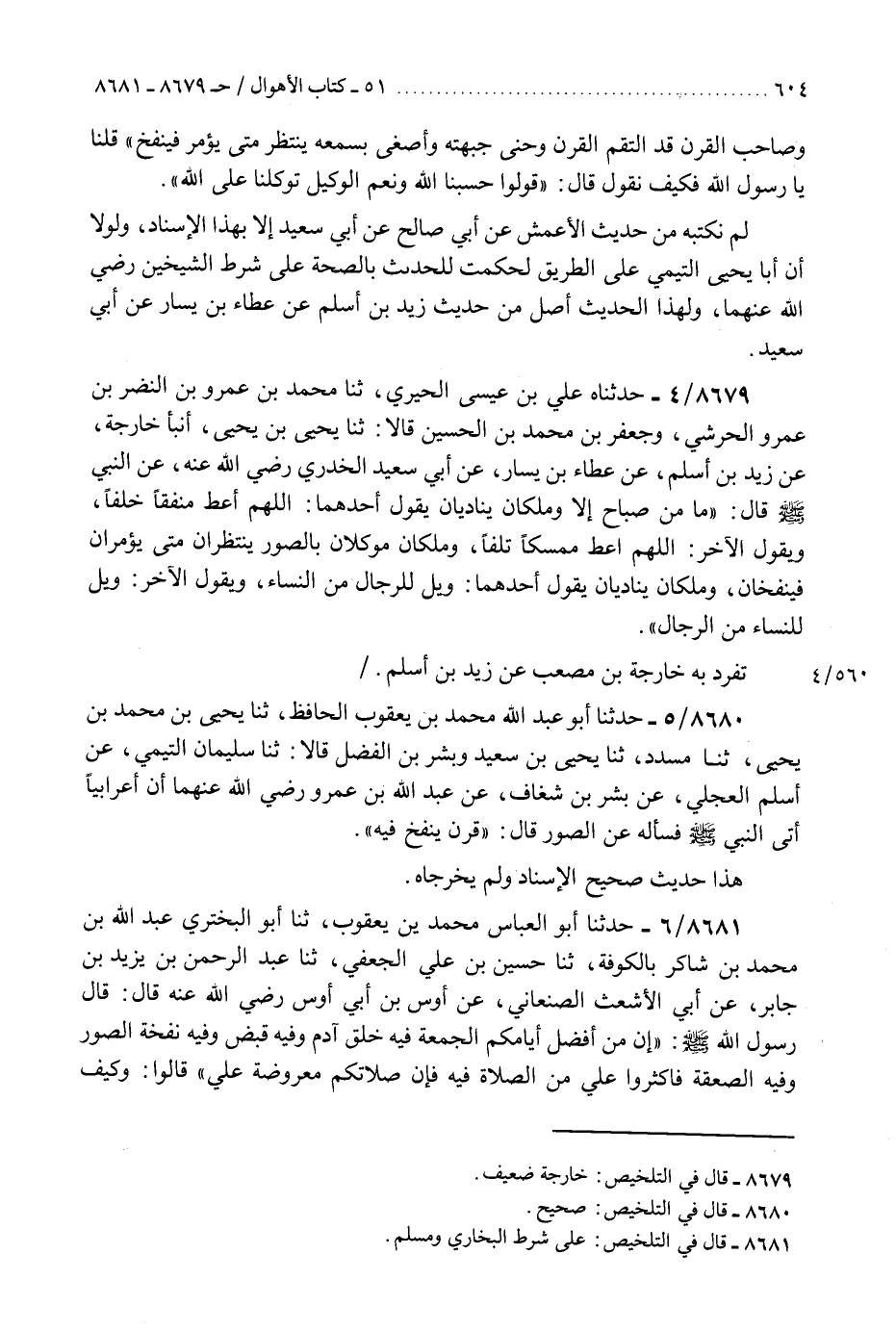 8680 - حَدَّثَنَا أَبُو عَبْدِ اللَّهِ مُحَمَّدُ بْنُ يَعْقُوبَ الْحَافِظُ، ثَنَا يَحْيَى بْنُ مُحَمَّدِ بْنِ يَحْيَى، ثَنَا مُسَدَّدٌ، ثَنَا يَحْيَى بْنُ سَعِيدٍ، وَبِشْرُ بْنُ الْفَضْلِ، قَالَا: ثَنَا سُلَيْمَانُ التَّيْمِيُّ، عَنْ أَسْلَمَ الْعِجْلِيِّ، عَنْ بِشْرِ بْنِ شَغَافٍ، عَنْ عَبْدِ اللَّهِ بْنِ عَمْرٍو رَضِيَ اللَّهُ عَنْهُمَا أَنَّ أَعْرَابِيًّا أَتَى النَّبِيَّ صَلَّى اللهُ عَلَيْهِ وَسَلَّمَ فَسَأَلَهُ عَنِ §الصُّورِ، قَالَ: «قَرْنٌ يُنْفَخُ فِيهِ» هَذَا حَدِيثٌ صَحِيحُ الْإِسْنَادِ، وَلَمْ يُخْرِجَاهُ "K8680 - صحيح
