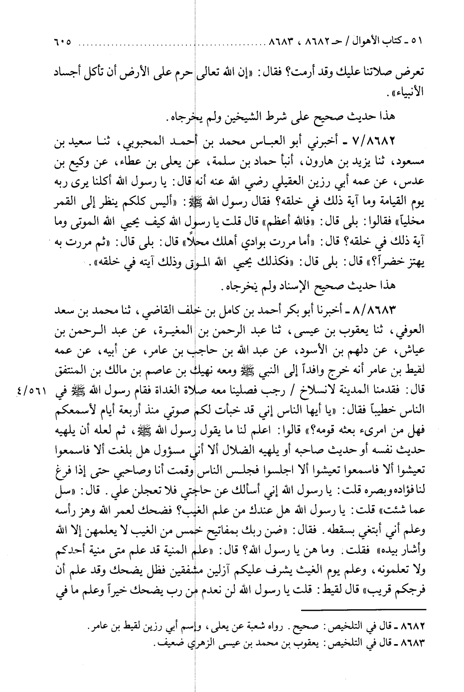 8683 - أَخْبَرَنَا أَبُو بَكْرٍ أَحْمَدُ بْنُ كَامِلِ بْنِ خَلَفٍ الْقَاضِي، ثَنَا مُحَمَّدُ بْنُ سَعْدٍ الْعَوْفِيُّ، ثَنَا يَعْقُوبُ بْنُ عِيسَى، ثَنَا عَبْدُ الرَّحْمَنِ بْنُ الْمُغِيرَةِ، عَنْ عَبْدِ الرَّحْمَنِ بْنِ عَيَّاشٍ، عَنْ دَلْهَمِ بْنِ الْأَسْوَدِ، عَنْ عَبْدِ اللَّهِ بْنِ حَاجِبِ بْنِ عَامِرٍ، عَنْ أَبِيهِ، عَنْ عَمِّهِ لَقِيطِ بْنِ عَامِرٍ أَنَّهُ خَرَجَ وَافِدًا إِلَى النَّبِيِّ صَلَّى اللهُ عَلَيْهِ وَسَلَّمَ، وَمَعَهُ نَهِيكُ بْنُ عَاصِمِ بْنِ مَالِكِ بْنِ الْمُنْتَفِقِ، قَالَ: فَقَدِمْنَا الْمَدِينَةَ لِانْسِلَاخِ رَجَبٍ، فَصَلَّيْنَا مَعَهُ صَلَاةَ الْغَدَاةِ، فَقَامَ رَسُولُ اللَّهِ صَلَّى اللهُ عَلَيْهِ وَسَلَّمَ فِي النَّاسِ خَطِيبًا، فَقَالَ: «يَا أَيُّهَا النَّاسُ، إِنِّي قَدْ خَبَأْتُ لَكُمْ صَوْتِي مُنْذُ أَرْبَعَةِ أَيَّامٍ لِأَسْمَعَكُمْ، فَهَلْ مِنَ امْرِئٍ بَعَثَهُ قَوْمُهُ؟» قَالُوا: اعْلَمْ لَنَا مَا يَقُولُ رَسُولُ اللَّهِ صَلَّى اللهُ عَلَيْهِ وَسَلَّمَ، ثُمَّ لَعَلَّهُ أَنْ يُلْهِيَهُ حَدِيثُ نَفْسِهِ، أَوْ حَدِيثُ صَاحِبِهِ، أَوْ يُلْهِيَهُ الضُّلَّالُ، أَلَا إِنِّي مَسْئُولٌ هَلْ بَلَّغْتُ أَلَا فَاسْمَعُوا تَعِيشُوا، أَلَا فَاسْمَعُوا تَعِيشُوا، أَلَا اجْلِسُوا، فَجَلَسَ النَّاسُ، وَقُمْتُ أَنَا وَصَاحِبِي حَتَّى إِذَا فَرَغَ لَنَا فُؤَادُهُ وَبَصَرُهُ قُلْتُ: يَا رَسُولَ اللَّهِ إِنِّي أَسْأَلُكَ عَنْ حَاجَتِي فَلَا تَعْجَلَنَّ عَلَيَّ، قَالَ: «سَلْ عَمَّا شِئْتَ» قُلْتُ: يَا رَسُولَ اللَّهِ هَلْ عِنْدَكَ مِنْ عِلْمِ الْغَيْبِ؟ فَضَحِكَ لَعَمْرُ اللَّهِ، وَهَزَّ رَأْسَهُ، وَعَلِمَ أَنِّي أَبْتَغِي بِسَقَطَهِ، فَقَالَ: «§ضَنَّ رَبُّكَ بِمَفَاتِيحِ خَمْسٍ مِنَ الْغَيْبِ، لَا يَعْلَمُهُنَّ إِلَّا اللَّهُ» وَأَشَارَ بِيَدِهِ فَقُلْتُ: وَمَا هُنَّ يَا رَسُولَ اللَّهِ؟ قَالَ: «عِلْمُ الْمَنِيَّةِ قَدْ عَلِمَ مَتَى مَنَيَّةُ أَحَدِكُمْ وَلَا تَعْلَمُونَهُ، وَعَلِمَ يَوْمَ الْغَيْثِ يُشْرِفُ عَلَيْكُمْ آزِلِينَ مُشْفِقِينَ، فَظَلَّ يَضْحَكُ وَقَدْ عَلِمَ أَنَّ فَرَجَكُمْ قَرِيبٌ» قَالَ لَقِيطٌ: قُلْتُ: يَا رَسُولَ اللَّهِ لَنْ نَعْدَمَ مَنْ رَبٍّ يَضْحَكُ خَيْرًا، «وَعَلِمَ مَا فِي غَدٍ، وَقَدْ عَلِمَ مَا أَنْتَ طَاعِمٌ فِي غَدٍ وَلَا تَعْلَمُهُ، وَعَلِمَ يَوْمَ السَّاعَةِ» ، قَالَ: وَأَحْسَبُهُ «ذَكَرَ مَا فِي الْأَرْحَامِ» K8683 - يعقوب بن محمد بن عيسى الزهري ضعيف