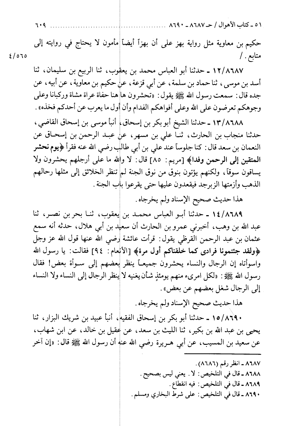 8689 - حَدَّثَنَا أَبُو الْعَبَّاسِ مُحَمَّدُ بْنُ يَعْقُوبَ، ثَنَا بَحْرُ بْنُ نَصْرٍ، ثَنَا عَبْدُ اللَّهِ بْنُ وَهْبٍ، أَخْبَرَنِي عَمْرُو بْنُ الْحَارِثِ، أَنَّ سَعِيدَ بْنَ أَبِي هِلَالٍ حَدَّثَهُ، أَنَّهُ سَمِعَ عُثْمَانَ بْنَ عَبْدِ الرَّحْمَنِ الْقُرَظِيَّ، يَقُولُ: قَرَأَتْ عَائِشَةُ رَضِيَ اللَّهُ عَنْهَا قَوْلَ اللَّهِ عَزَّ وَجَلَّ: {وَلَقَدْ جِئْتُمُونَا فُرَادَى كَمَا خَلَقْنَاكُمْ أَوَّلَ مَرَّةٍ} [الأنعام: 94] فَقَالَتْ: يَا رَسُولَ اللَّهِ وَاسَوْأَتَاهُ إِنَّ الرِّجَالَ وَالنِّسَاءَ يُحْشَرُونَ جَمِيعًا يَنْظُرُ بَعْضُهُمْ إِلَى سَوْأَةِ بَعْضٍ؟ فَقَالَ رَسُولُ اللَّهِ صَلَّى اللهُ عَلَيْهِ وَسَلَّمَ: «§لِكُلِّ امْرِئٍ مِنْهُمْ يَوْمَئِذٍ شَأْنٌ يُغْنِيهِ، لَا يَنْظُرُ الرِّجَالُ إِلَى النِّسَاءِ، وَلَا النِّسَاءُ إِلَى الرِّجَالِ، شُغِلَ بَعْضُهُمْ عَنْ بَعْضٍ» هَذَا حَدِيثٌ صَحِيحُ الْإِسْنَادِ، وَلَمْ يُخْرِجَاهُ "K8689 - فيه انقطاع