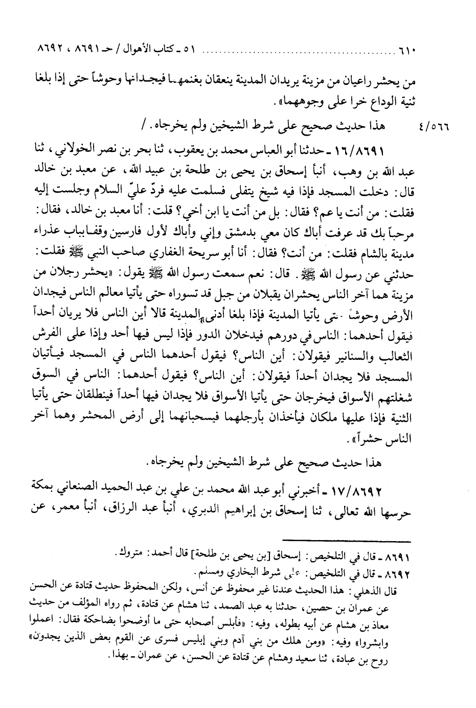 8691 - حَدَّثَنَا أَبُو الْعَبَّاسِ مُحَمَّدُ بْنُ يَعْقُوبَ، ثَنَا بَحْرُ بْنُ نَصْرٍ الْخَوْلَانِيُّ، ثَنَا عَبْدُ اللَّهِ بْنُ وَهْبٍ، أَنْبَأَ إِسْحَاقُ بْنُ يَحْيَى بْنِ طَلْحَةَ بْنِ عُبَيْدِ اللَّهِ، عَنْ مَعْبَدِ بْنِ خَالِدٍ، قَالَ: دَخَلْتُ الْمَسْجِدَ فَإِذَا فِيهِ شَيْخٌ يَتَفَلَّى، فَسَلَّمْتُ عَلَيْهِ فَرَدَّ عَلَيَّ السَّلَامَ، وَجَلَسْتُ إِلَيْهِ فَقُلْتُ: مَنْ أَنْتَ يَا عَمُّ؟ فَقَالَ: بَلْ مَنْ أَنْتَ يَا ابْنَ أَخِي؟ قُلْتُ: أَنَا مَعْبَدُ بْنُ خَالِدٍ، فَقَالَ: مَرْحَبًا بِكَ قَدْ عَرَفْتُ أَبَاكَ كَانَ مَعِي بِدِمَشْقَ، وَإِنِّي وَأَبَاكَ لَأَوَّلُ فَارِسَيْنِ وَقَفَا بِبَابِ عَذْرَاءَ - مَدِينَةٌ بِالشَّامِ - فَقُلْتُ: مَنْ أَنْتَ؟ فَقَالَ: أَنَا أَبُو سَرِيحَةَ الْغِفَارِيُّ صَاحِبُ النَّبِيِّ صَلَّى اللهُ عَلَيْهِ وَسَلَّمَ، فَقُلْتُ: حَدِّثْنِي عَنْ رَسُولِ اللَّهِ صَلَّى اللهُ عَلَيْهِ وَسَلَّمَ، قَالَ: نَعَمْ، سَمِعْتُ رَسُولَ اللَّهِ صَلَّى اللهُ عَلَيْهِ وَسَلَّمَ، يَقُولُ: " §يُحْشَرُ رَجُلَانِ مَنْ مُزَيْنَةَ هُمَا آخِرُ النَّاسِ يُحْشَرَانِ، يُقْبِلَانِ مَنْ جَبَلٍ قَدْ تَسَوَّرَاهُ حَتَّى يَأْتِيَا مَعَالِمَ النَّاسِ فَيَجِدَانِ الْأَرْضَ وُحُوشًا حَتَّى يَأْتِيَا الْمَدِينَةَ، فَإِذَا بَلَغَا أَدْنَى الْمَدِينَةِ قَالَا: أَيْنَ النَّاسُ؟ فَلَا يَرَيَانِ أَحَدًا، فَيَقُولُ أَحَدُهُمَا: النَّاسُ فِي دُورِهِمْ، فَيَدْخُلَانِ الدُّورَ فَإِذَا لَيْسَ فِيهَا أَحَدٌ، وَإِذَا عَلَى الْفُرُشِ الثَّعَالِبُ وَالسَّنَانِيرُ، فَيَقُولَانِ: أَيْنَ النَّاسُ؟ فَيَقُولُ أَحَدُهُمَا، النَّاسُ فِي الْمَسْجِدِ فَيَأْتِيَانِ الْمَسْجِدَ فَلَا يَجِدَانِ أَحَدًا، فَيَقُولَانِ: أَيْنَ النَّاسُ؟ فَيَقُولُ أَحَدُهُمَا: النَّاسُ فِي السُّوقِ شَغَلَتْهُمُ الْأَسْوَاقُ، فَيَخْرُجَانِ حَتَّى يَأْتِيَا الْأَسْوَاقَ فَلَا يَجِدَانِ فِيهَا أَحَدًا، فَيَنْطَلِقَانِ حَتَّى يَأْتِيَا الثَّنِيَّةَ فَإِذَا عَلَيْهَا مَلَكَانِ فَيَأْخُذَانِ بِأَرْجِلِهِمَا فَيَسْحَبَانِهِمَا إِلَى أَرْضِ الْمَحْشَرِ، وَهُمَا آخِرُ النَّاسِ حَشْرًا «هَذَا حَدِيثٌ صَحِيحٌ عَلَى شَرْطِ الشَّيْخَيْنِ، وَلَمْ يُخْرِجَاهُ» K8691 - إسحاق بن يحيى بن طلحة قال أحمد متروك