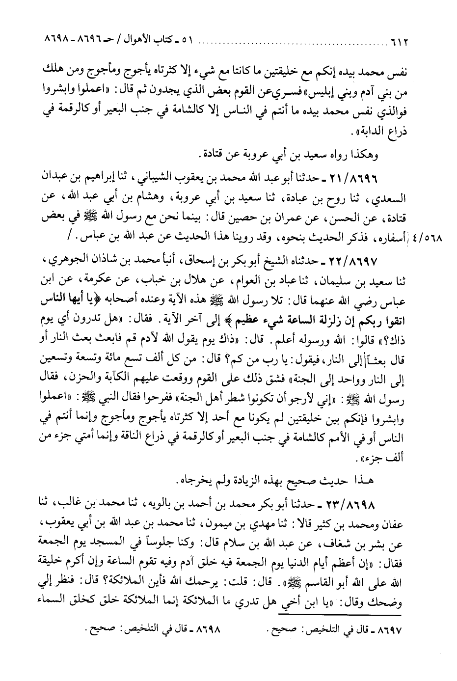 8697 - حَدَّثَنَاهُ الشَّيْخُ أَبُو بَكْرِ بْنُ إِسْحَاقَ، أَنْبَأَ مُحَمَّدُ بْنُ شَاذَانَ الْجَوْهَرِيُّ، ثَنَا سَعِيدُ بْنُ سُلَيْمَانَ، ثَنَا عَبَّادُ بْنُ الْعَوَّامِ، عَنْ هِلَالِ بْنِ خَبَّابٍ، عَنْ عِكْرِمَةَ، عَنِ ابْنِ عَبَّاسٍ رَضِيَ اللَّهُ عَنْهُمَا، قَالَ: تَلَا رَسُولُ اللَّهِ صَلَّى اللهُ عَلَيْهِ وَسَلَّمَ هَذِهِ الْآيَةَ وَعِنْدَهُ أَصْحَابُهُ: {يَا أَيُّهَا النَّاسُ اتَّقُوا رَبَّكُمْ إِنَّ زَلْزَلَةَ السَّاعَةِ شَيْءٌ عَظِيمٌ} [الحج: 1] إِلَى آخِرِ الْآيَةِ، فَقَالَ: «هَلْ تَدْرُونَ أَيُّ يَوْمٍ ذَاكَ؟» قَالُوا: اللَّهُ وَرَسُولُهُ أَعْلَمُ، قَالَ: " ذَاكَ يَوْمَ يَقُولُ اللَّهُ لِآدَمَ: §قُمْ فَابْعَثْ بَعْثَ النَّارِ - أَوْ قَالَ: بَعْثًا إِلَى النَّارِ - فَيَقُولُ: يَا رَبِّ مِنْ كَمْ؟ قَالَ: مِنْ كُلِّ أَلْفٍ تِسْعَ مِائَةٍ وَتِسْعَةً وَتِسْعِينَ إِلَى النَّارِ وَوَاحِدٌ إِلَى الْجَنَّةِ " فَشَقَّ ذَلِكَ عَلَى الْقَوْمِ، وَوَقَعَتْ عَلَيْهِمُ الْكَآبَةُ وَالْحُزْنُ، فَقَالَ رَسُولُ اللَّهِ صَلَّى اللهُ عَلَيْهِ وَسَلَّمَ: «إِنِّي لَأَرْجُو أَنْ تَكُونُوا شَطْرَ أَهْلِ الْجَنَّةِ» فَفَرِحُوا، فَقَالَ النَّبِيُّ صَلَّى اللهُ عَلَيْهِ وَسَلَّمَ: «اعْمَلُوا وَأَبْشِرُوا فَإِنَّكُمْ بَيْنَ خَلِيقَتَيْنِ لَمْ يَكُونَا مَعَ أَحَدٍ إِلَّا كَثَّرَتَاهُ يَأْجُوجُ وَمَأْجُوجُ، وَإِنَّمَا أَنْتُمْ فِي النَّاسِ - أَوْ فِي الْأُمَمِ - كَالشَّامَةِ فِي جَنْبِ الْبَعِيرِ أَوْ كَالرَّقْمَةِ فِي ذِرَاعِ النَّاقَةِ، وَإِنَّمَا أُمَّتِي جُزْءٌ مَنْ أَلْفِ جُزْءٍ» هَذَا حَدِيثٌ صَحِيحٌ بِهَذِهِ الزِّيَادَةِ، وَلَمْ يُخْرِجَاهُ "K8697 - صحيح