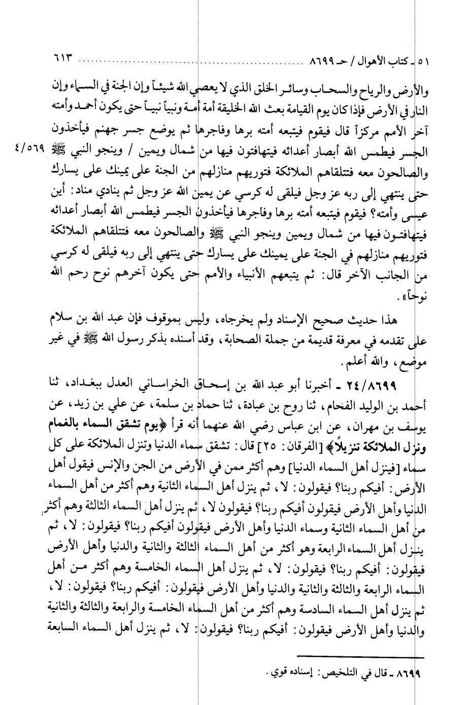 8699 - أَخْبَرَنَا أَبُو عَبْدِ اللَّهِ بْنُ إِسْحَاقَ الْخُرَاسَانِيُّ الْعَدْلُ، بِبَغْدَادَ، ثَنَا أَحْمَدُ بْنُ الْوَلِيدِ الْفَحَّامُ، ثَنَا رَوْحُ بْنُ عُبَادَةَ، ثَنَا حَمَّادُ بْنُ سَلَمَةَ، عَنْ عَلِيِّ بْنِ زَيْدٍ، عَنْ يُوسُفَ بْنِ مِهْرَانَ، عَنِ ابْنِ عَبَّاسٍ رَضِيَ اللَّهُ عَنْهُمَا، أَنَّهُ قَرَأَ: {§يَوْمَ تَشَقَّقُ السَّمَاءُ بِالْغَمَامِ وَنُزِّلَ الْمَلَائِكَةُ تَنْزِيلًا} [الفرقان: 25] قَالَ: " تَشَقَّقُ سَمَاءُ الدُّنْيَا وَتَنْزِلُ الْمَلَائِكَةُ عَلَى كُلِّ سَمَاءٍ، فَيَنْزِلُ أَهْلُ السَّمَاءِ الدُّنْيَا وَهُمْ أَكْثَرُ مِمَّنْ فِي الْأَرْضِ مِنَ الْجِنِّ وَالْإِنْسِ، فَيَقُولُ أَهْلُ الْأَرْضِ: أَفِيكُمْ رَبُّنَا؟ فَيَقُولُونَ: لَا، ثُمَّ يَنْزِلُ أَهْلُ السَّمَاءِ الثَّانِيَةِ وَهُمْ أَكْثَرُ مِنْ أَهْلِ السَّمَاءِ الدُّنْيَا وَأَهْلِ الْأَرْضِ فَيَقُولُونَ: أَفِيكُمْ رَبُّنَا؟ فَيَقُولُونَ: لَا، ثُمَّ يَنْزِلُ أَهْلُ السَّمَاءِ الثَّالِثَةِ وَهُمْ أَكْثَرُ مِنْ أَهْلِ السَّمَاءِ الثَّانِيَةِ وَسَمَاءِ الدُّنْيَا وَأَهْلِ الْأَرْضِ فَيَقُولُونَ: أَفِيكُمْ رَبُّنَا؟ فَيَقُولُونَ: لَا، ثُمَّ يَنْزِلُ أَهْلُ السَّمَاءِ الرَّابِعَةِ وَهُمْ أَكْثَرُ مَنْ أَهْلِ السَّمَاءِ الثَّالِثَةِ وَالثَّانِيَةِ وَالدُّنْيَا وَأَهْلِ الْأَرْضِ فَيَقُولُونَ: أَفِيكُمْ رَبُّنَا؟ فَيَقُولُونَ: لَا، ثُمَّ يَنْزِلُ أَهْلُ السَّمَاءِ الْخَامِسَةِ وَهُمْ أَكْثَرُ مِنْ أَهْلِ السَّمَاءِ الرَّابِعَةِ وَالثَّالِثَةِ وَالثَّانِيَةِ وَالدُّنْيَا وَأَهْلِ الْأَرْضِ فَيَقُولُونَ: أَفِيكُمْ رَبُّنَا؟ فَيَقُولُونَ: لَا، ثُمَّ يَنْزِلُ أَهْلُ السَّمَاءِ السَّادِسَةِ وَهُمْ أَكْثَرُ مِنْ أَهْلِ السَّمَاءِ الْخَامِسَةِ وَالرَّابِعَةِ وَالثَّالِثَةِ وَالثَّانِيَةِ وَالدُّنْيَا وَأَهْلِ الْأَرْضِ فَيَقُولُونَ: أَفِيكُمْ رَبُّنَا؟ فَيَقُولُونَ: لَا، ثُمَّ يَنْزِلُ أَهْلُ السَّمَاءِ السَّابِعَةِ وَهُمْ أَكْثَرُ مِنْ أَهْلِ السَّمَاءِ السَّادِسَةِ وَالْخَامِسَةِ وَالرَّابِعَةِ وَالثَّالِثَةِ وَالثَّانِيَةِ وَالدُّنْيَا وَأَهْلِ الْأَرْضِ فَيَقُولُونَ: أَفِيكُمْ رَبُّنَا؟ فَيَقُولُونَ: لَا ثُمَّ يَنْزِلُ الْكُرُوبِيُّونَ وَهُمْ أَكْثَرُ مَنْ أَهْلِ السَّمَاوَاتِ السَّبْعِ وَالْأَرَضِينَ وَحَمَلَةِ الْعَرْشِ لَهُمْ قُرُونٌ كُعُوبٌ كَكُعُوبِ الْقَنَا، مَا بَيْنَ قَدَمِ أَحَدِهِمْ كَذَا وَكَذَا، وَمِنْ أَخْمَصِ قَدَمِهِ إِلَى كَعْبِهِ مَسِيرَةُ خَمْسِمِائَةِ عَامٍ، وَمِنْ كَعْبِهِ إِلَى رُكْبَتِهِ مَسِيرَةُ خَمْسِمِائَةِ، وَمِنْ رُكْبَتِهِ إِلَى أَرْنَبَتِهِ مَسِيرَةُ خَمْسِمِائَةِ عَامٍ، وَمِنْ تَرْقُوَتِهِ إِلَى مَوْضِعِ الْقُرْطِ مَسِيرَةُ خَمْسِمِائَةِ عَامٍ «رُوَاةُ هَذَا الْحَدِيثِ عَنْ آخِرِهِمْ مُحْتَجٌّ بِهِمْ غَيْرَ عَلِيِّ بْنِ زَيْدِ بْنِ جُدْعَانَ الْقُرَشِيِّ وَهُوَ وَإِنْ كَانَ مَوْقُوفًا عَلَى ابْنِ عَبَّاسٍ فَإِنَّهُ عَجِيبٌ بِمَرَّةٍ» K8699 - إسناده قوي