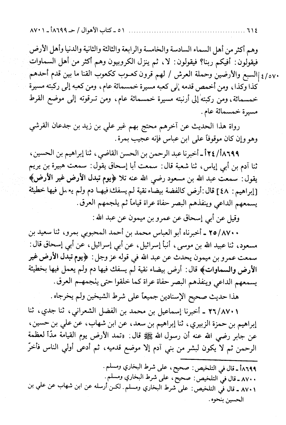 8700 - أَخْبَرَنَاهُ أَبُو الْعَبَّاسِ مُحَمَّدُ بْنُ أَحْمَدَ الْمَحْبُوبِيُّ بِمَرْوَ، ثَنَا سَعِيدُ بْنُ مَسْعُودٍ، ثَنَا عُبَيْدُ اللَّهِ بْنُ مُوسَى، أَنْبَأَ إِسْرَائِيلُ، عَنْ أَبِي إِسْرَائِيلَ، عَنْ أَبِي إِسْحَاقَ، قَالَ: سَمِعْتُ عَمْرَو بْنَ مَيْمُونٍ، يُحَدِّثُ، عَنْ عَبْدِ اللَّهِ، فِي قَوْلِهِ عَزَّ وَجَلَّ: {§يَوْمَ تُبَدَّلُ الْأَرْضُ غَيْرَ الْأَرْضِ وَالسَّمَاوَاتُ} [إبراهيم: 48] قَالَ: «أَرْضٌ بَيْضَاءُ نَقِيَّةٌ لَمْ يُسْفَكْ فِيهَا دَمٌ وَلَمْ يُعْمَلْ فِيهَا بِخَطِيئَةٍ يَسْمَعُهُمُ الدَّاعِي وَيَنْفُذُهُمُ الْبَصَرُ حُفَاةٌ عُرَاةٌ كَمَا خُلِقُوا حَتَّى يُلْجِمَهُمُ الْعَرَقُ» هَذَا حَدِيثٌ صَحِيحُ الْإِسْنَادَيْنِ جَمِيعًا عَلَى شَرْطِ الشَّيْخَيْنِ وَلَمْ يُخْرِجَاهُ "K8700 - صحيح على شرط البخاري ومسلم