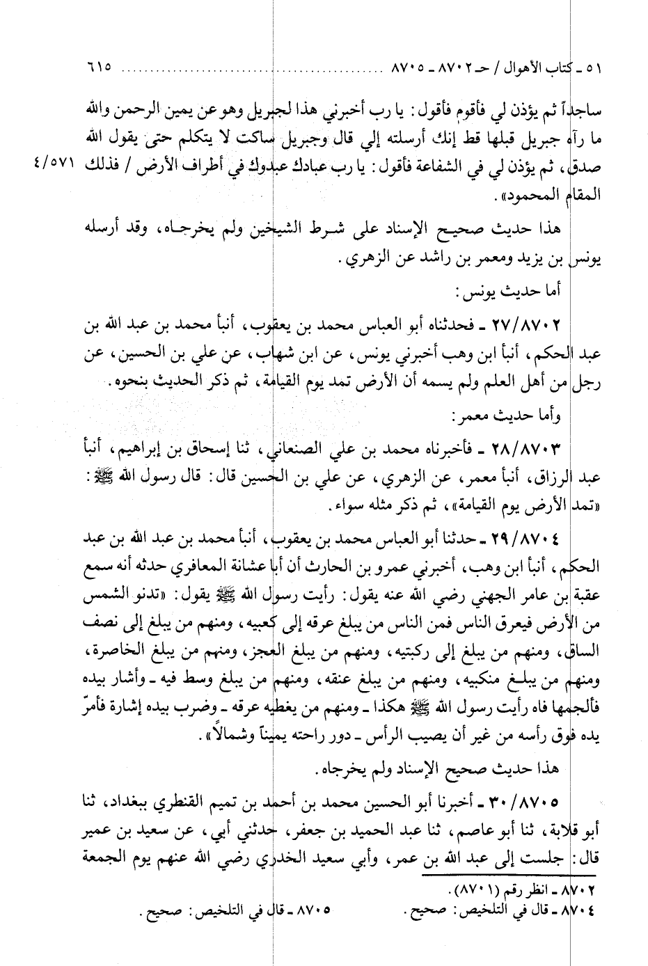 8704 - حَدَّثَنَا أَبُو الْعَبَّاسِ مُحَمَّدُ بْنُ يَعْقُوبَ، أَنْبَأَ مُحَمَّدُ بْنُ عَبْدِ اللَّهِ بْنِ عَبْدِ الْحَكَمِ، أَنْبَأَ ابْنُ وَهْبٍ، أَخْبَرَنِي عَمْرُو بْنُ الْحَارِثِ، أَنَّ أَبَا عُشَّانَةَ الْمَعَافِرِيَّ، حَدَّثَهُ أَنَّهُ، سَمِعَ عُقْبَةَ بْنَ عَامِرٍ الْجُهَنِيَّ رَضِيَ اللَّهُ عَنْهُ، يَقُولُ: رَأَيْتُ رَسُولَ اللَّهِ صَلَّى اللهُ عَلَيْهِ وَسَلَّمَ، يَقُولُ: «§تَدْنُو الشَّمْسُ مِنَ الْأَرْضِ فَيَعْرَقُ النَّاسُ، فَمِنَ النَّاسِ مَنْ يَبْلُغُ عَرَقُهُ إِلَى كَعْبَيْهِ، وَمِنْهُمْ مَنْ يَبْلُغُ إِلَى نِصْفِ السَّاقِ، وَمِنْهُمْ مَنْ يَبْلُغُ إِلَى رُكْبَتَيْهِ، وَمِنْهُمْ مَنْ يَبْلُغُ الْعَجُزَ، وَمِنْهُمْ مَنْ يَبْلُغُ الْخَاصِرَةَ، وَمِنْهُمْ مَنْ يَبْلُغُ مَنْكِبَيْهِ، وَمِنْهُمْ مَنْ يَبْلُغُ عُنُقَهُ، وَمِنْهُمْ مَنْ يَبْلُغُ وَسَطَ فِيهِ وَأَشَارَ بِيَدِهِ فَأَلْجَمَهَا فَاهُ، رَأَيْتُ رَسُولَ اللَّهِ صَلَّى اللهُ عَلَيْهِ وَسَلَّمَ هَكَذَا وَمِنْهُمْ مَنْ يُغَطِّيهِ عَرَقُهُ وَضَرَبَ بِيَدِهِ إِشَارَةً فَأَمَرَّ يَدَهُ فَوْقَ رَأْسِهِ مَنْ غَيْرِ أَنْ يُصِيبَ الرَّأْسَ دُوَّرَ رَاحَتَهُ يَمِينًا وَشِمَالًا» هَذَا حَدِيثٌ صَحِيحُ الْإِسْنَادِ وَلَمْ يُخْرِجَاهُ "K8704 - صحيح