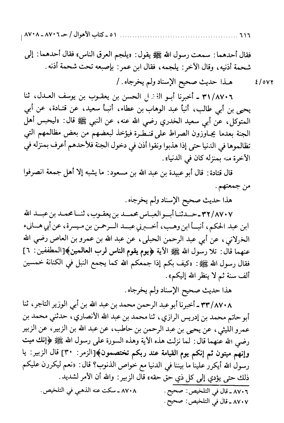 8708 - أَخْبَرَنَا أَبُو عَبْدِ الرَّحْمَنِ مُحَمَّدُ بْنُ عَبْدِ اللَّهِ بْنِ أَبِي الْوَزِيرِ التَّاجِرُ، ثَنَا أَبُو حَاتِمٍ مُحَمَّدُ بْنُ إِدْرِيسَ الرَّازِيُّ، ثَنَا مُحَمَّدُ بْنُ عَبْدِ اللَّهِ الْأَنْصَارِيُّ، حَدَّثَنِي مُحَمَّدُ بْنُ عَمْرٍو اللَّيْثِيُّ، عَنْ يَحْيَى بْنِ عَبْدِ الرَّحْمَنِ بْنِ حَاطِبٍ، عَنْ عَبْدِ اللَّهِ بْنِ الزُّبَيْرِ، عَنِ الزُّبَيْرِ رَضِيَ اللَّهُ عَنْهُمَا، قَالَ: لَمَّا نَزَلَتْ هَذِهِ الْآيَةُ وَهَذِهِ السُّورَةُ عَلَى رَسُولِ اللَّهِ صَلَّى اللهُ عَلَيْهِ وَسَلَّمَ: {إِنَّكَ مَيِّتٌ وَإِنَّهُمْ مَيِّتُونَ ثُمَّ إِنَّكُمْ يَوْمَ الْقِيَامَةِ عِنْدَ رَبِّكُمْ تَخْتَصِمُونَ} [الزمر: 31] قَالَ الزُّبَيْرُ: يَا رَسُولَ اللَّهِ أَيُكَرَّرُ عَلَيْنَا مَا بَيْنَنَا فِي الدُّنْيَا مَعَ خَوَاصِّ الذُّنُوبِ؟ قَالَ: «نَعَمْ، §لَيُكَرَّرَنَّ عَلَيْكُمْ ذَلِكَ حَتَّى يُؤَدِّيَ إِلَى كُلِّ ذِي حَقٍّ حَقَّهُ» قَالَ الزُّبَيْرُ: «وَاللَّهِ إِنَّ الْأَمْرَ لَشَدِيدٌ» هَذَا حَدِيثٌ صَحِيحُ الْإِسْنَادِ وَلَمْ يُخْرِجَاهُ "K8708 - سكت عنه الذهبي في التلخيص