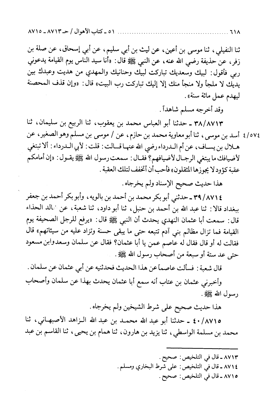8714 - حَدَّثَنِي أَبُو بَكْرٍ مُحَمَّدُ بْنُ أَحْمَدَ بْنِ بَالَوَيْهِ، وَأَبُو بَكْرٍ أَحْمَدُ بْنُ جَعْفَرٍ بِبَغْدَادَ، قَالَا: ثَنَا عَبْدُ اللَّهِ بْنُ أَحْمَدَ بْنِ حَنْبَلٍ، ثَنَا أَبُو دَاوُدَ، ثَنَا شُعْبَةُ، عَنْ خَالِدٍ الْحَذَّاءِ، قَالَ: سَمِعْتُ أَبَا عُثْمَانَ النَّهْدِيَّ يُحَدِّثُ أَنَّ النَّبِيَّ صَلَّى اللهُ عَلَيْهِ وَسَلَّمَ، قَالَ: §«يُرْفَعُ لِلرَّجُلِ الصَّحِيفَةُ يَوْمَ الْقِيَامَةِ فَمَا تَزَالُ مَظَالِمُ بَنِي آدَمَ تَتْبَعُهُ حَتَّى مَا يَبْقَى حَسَنَةٌ، وَتُزَادُ عَلَيْهِ مَنْ سَيِّئَاتِهِمْ» قَالَ: فَقَالَتْ لَهُ - أَوْ قَالَ: فَقَالَ لَهُ عَاصِمٌ - عَمَّنْ يَا أَبَا عُثْمَانَ، فَقَالَ: عَنْ سَلْمَانَ، وَسَعْدٍ، وَابْنِ مَسْعُودٍ حَتَّى عَدَّ سِتَّةً أَوْ سَبْعَةً مَنْ أَصْحَابِ رَسُولِ اللَّهِ صَلَّى اللهُ عَلَيْهِ وَسَلَّمَ قَالَ شُعْبَةُ: فَسَأَلْتُ عَاصِمًا عَنْ هَذَا الْحَدِيثِ فَحَدَّثَنِيهِ، عَنْ أَبِي عُثْمَانَ، عَنْ سَلْمَانَ، وَأَخْبَرَنِي عُثْمَانُ بْنُ عَتَّابٍ، أَنَّهُ سَمِعَ أَبَا عُثْمَانَ، يُحَدِّثُ بِهَذَا عَنْ سَلْمَانَ وَأَصْحَابِ رَسُولِ اللَّهِ صَلَّى اللهُ عَلَيْهِ وَسَلَّمَ «هَذَا حَدِيثٌ صَحِيحٌ عَلَى شَرْطِ الشَّيْخَيْنِ وَلَمْ يُخْرِجَاهُ» K8714 - على شرط البخاري ومسلم