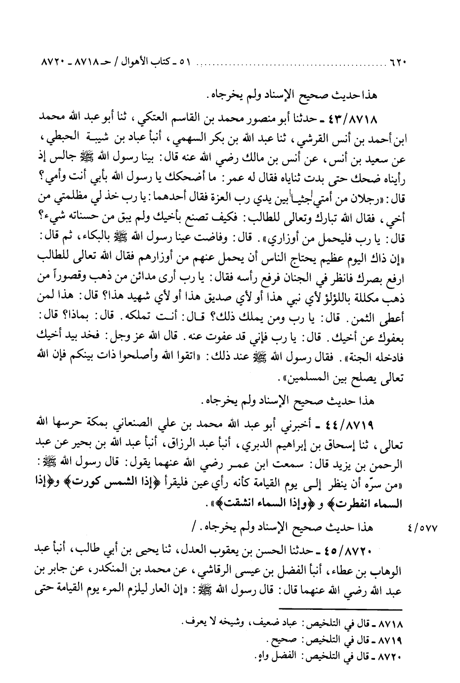 8718 - حَدَّثَنَا أَبُو مَنْصُورٍ مُحَمَّدُ بْنُ الْقَاسِمِ الْعَتَكِيُّ، ثَنَا أَبُو عَبْدِ اللَّهِ مُحَمَّدُ بْنُ أَحْمَدَ بْنِ أَنَسٍ الْقُرَشِيُّ، ثَنَا عَبْدُ اللَّهِ بْنُ بَكْرٍ السَّهْمِيُّ، أَنْبَأَ عَبَّادُ بْنُ شَيْبَةَ الْحَبَطِيُّ، عَنْ سَعِيدِ بْنِ أَنَسٍ، عَنْ أَنَسِ بْنِ مَالِكٍ رَضِيَ اللَّهُ عَنْهُ، قَالَ: بَيْنَا رَسُولُ اللَّهِ صَلَّى اللهُ عَلَيْهِ وَسَلَّمَ جَالِسٌ إِذْ رَأَيْنَاهُ ضَحِكَ حَتَّى بَدَتْ ثَنَايَاهُ، فَقَالَ لَهُ عُمَرُ: مَا أَضْحَكَكَ يَا رَسُولَ اللَّهِ بِأَبِي أَنْتَ وَأُمِّي؟ قَالَ: " رَجُلَانِ مِنْ أُمَّتِي جَثَيَا بَيْنَ يَدَيْ رَبِّ الْعِزَّةِ، فَقَالَ أَحَدُهُمَا: يَا رَبِّ خُذْ لِي مَظْلِمَتِي مِنْ أَخِي، فَقَالَ اللَّهُ تَبَارَكَ وَتَعَالَى لِلطَّالِبِ: §فَكَيْفَ تَصْنَعُ بِأَخِيكِ وَلَمْ يَبْقَ مِنْ حَسَنَاتِهِ شَيْءٌ؟ قَالَ: يَا رَبِّ فَلْيَحْمِلْ مِنْ أَوْزَارِي " قَالَ: وَفَاضَتْ عَيْنَا رَسُولِ اللَّهِ صَلَّى اللهُ عَلَيْهِ وَسَلَّمَ بِالْبُكَاءِ، ثُمَّ قَالَ: " إِنَّ ذَاكَ الْيَوْمَ عَظِيمٌ يَحْتَاجُ النَّاسُ أَنْ يُحْمَلَ عَنْهُمْ مِنْ أَوْزَارِهِمْ، فَقَالَ اللَّهُ تَعَالَى لِلطَّالِبِ: " ارْفَعْ بَصَرَكَ فَانْظُرْ فِي الْجِنَّانِ فَرَفَعَ رَأْسَهُ، فَقَالَ: يَا رَبِّ أَرَى مَدَائِنَ مِنْ ذَهَبٍ وَقُصُورًا مِنْ ذَهَبً مُكَلَّلَةً بِالُّلؤْلُؤِ لِأَيِّ نَبِيٍّ هَذَا أَوْ لِأَيِّ صِدِّيقٍ هَذَا أَوْ لِأَيِّ شَهِيدٍ هَذَا؟ قَالَ: هَذَا لِمَنْ أَعْطَى الثَّمَنَ، قَالَ: يَا رَبِّ وَمَنْ يَمْلِكُ ذَلِكَ؟ قَالَ: أَنْتَ تَمْلِكُهُ، قَالَ: بِمَاذَا؟ قَالَ: بِعَفْوِكَ عَنْ أَخِيكَ، قَالَ: يَا رَبِّ فَإِنِّي قَدْ عَفَوْتُ عَنْهُ، قَالَ اللَّهُ عَزَّ وَجَلَّ: فَخُذْ بِيَدِ أَخِيكَ فَأَدْخِلْهُ الْجَنَّةَ " فَقَالَ رَسُولُ اللَّهِ صَلَّى اللهُ عَلَيْهِ وَسَلَّمَ عِنْدَ ذَلِكَ: «اتَّقُوا اللَّهَ وَأَصْلِحُوا ذَاتَ بَيْنِكُمْ فَإِنَّ اللَّهَ تَعَالَى يُصْلِحُ بَيْنَ الْمُسْلِمِينَ» هَذَا حَدِيثٌ صَحِيحُ الْإِسْنَادِ وَلَمْ يُخْرِجَاهُ "