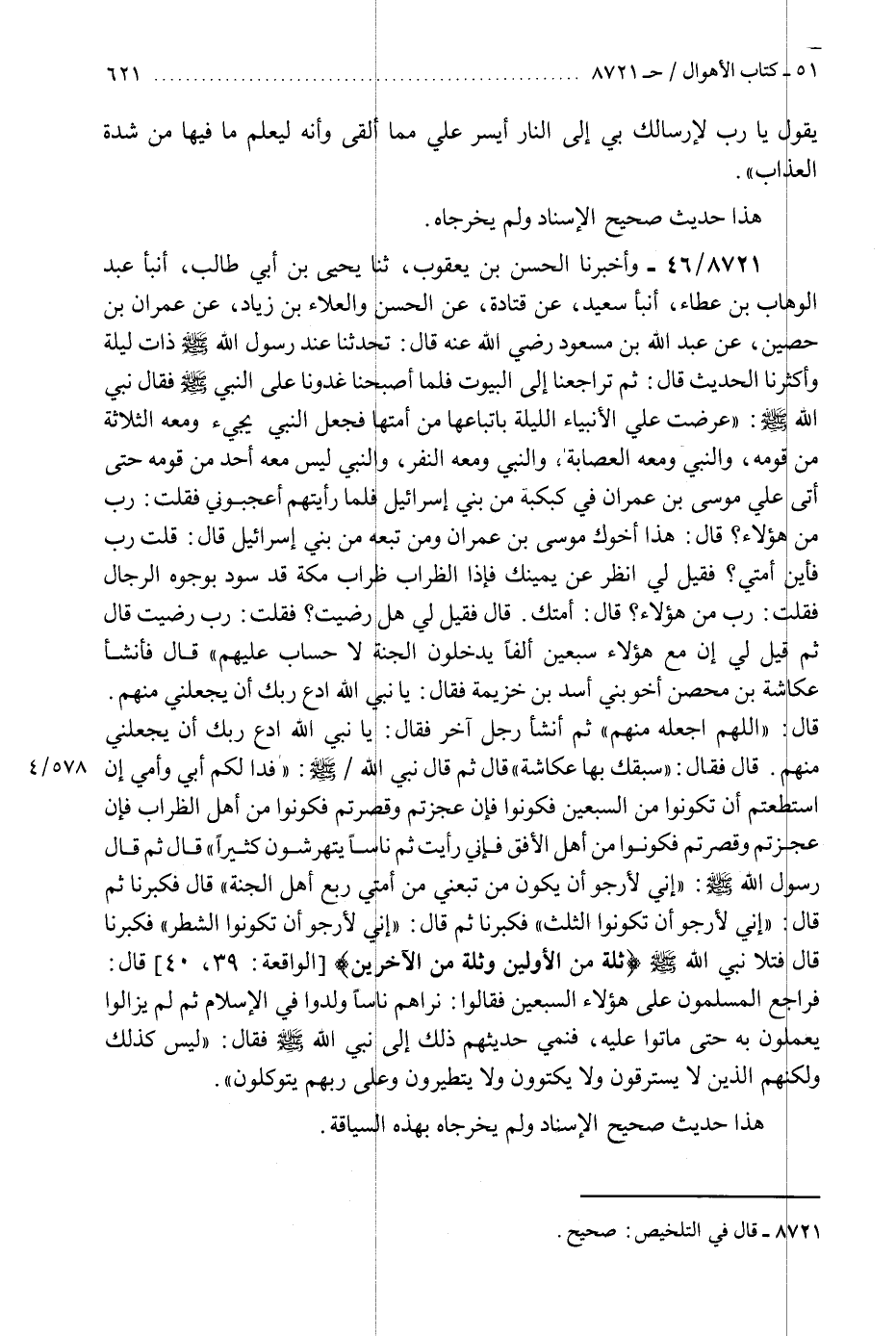 8721 - وَأَخْبَرَنَا الْحَسَنُ بْنُ يَعْقُوبَ، ثَنَا يَحْيَى بْنُ أَبِي طَالِبٍ، أَنْبَأَ عَبْدُ الْوَهَّابِ بْنُ عَطَاءٍ، أَنْبَأَ سَعِيدٌ، عَنْ قَتَادَةَ، عَنِ الْحَسَنِ، وَالْعَلَاءِ بْنِ زِيَادٍ، عَنْ عِمْرَانَ بْنِ حُصَيْنٍ، عَنْ عَبْدِ اللَّهِ بْنِ مَسْعُودٍ رَضِيَ اللَّهُ عَنْهُ، قَالَ: تَحَدَّثْنَا عِنْدَ رَسُولِ اللَّهِ صَلَّى اللهُ عَلَيْهِ وَسَلَّمَ ذَاتَ لَيْلَةٍ وَأَكْثَرْنَا الْحَدِيثَ، قَالَ: ثُمَّ تَرَاجَعْنَا إِلَى الْبُيُوتِ فَلَمَّا أَصْبَحْنَا غَدَوْنَا عَلَى النَّبِيِّ صَلَّى اللهُ عَلَيْهِ وَسَلَّمَ، فَقَالَ نَبِيُّ اللَّهِ صَلَّى اللهُ عَلَيْهِ وَسَلَّمَ: " عُرِضَتْ عَلَيَّ الْأَنْبِيَاءُ اللَّيْلَةَ بِأَتْبَاعِهَا مِنْ أُمَّتِهَا فَجَعَلَ النَّبِيُّ يَجِيءُ وَمَعَهُ الثَّلَاثَةُ مِنْ قَوْمِهِ، وَالنَّبِيُّ وَمَعَهُ الْعِصَابَةُ، وَالنَّبِيُّ وَمَعَهُ النَّفْرُ، وَالنَّبِيُّ لَيْسَ مَعَهُ أَحَدٌ مِنْ قَوْمِهِ، حَتَّى أَتَى عَلَيَّ مُوسَى بْنُ عِمْرَانَ فِي كَبْكَبَةٍ مِنْ بَنِي إِسْرَائِيلَ فَلَمَّا رَأَيْتُهُمْ أَعْجَبُونِي، فَقُلْتُ: رَبِّ مَنْ هَؤُلَاءِ؟ قَالَ: §هَذَا أَخُوكَ مُوسَى بْنُ عِمْرَانَ وَمَنْ تَبِعَهُ مِنْ بَنِي إِسْرَائِيلَ، قَالَ: قُلْتُ: رَبِّ فَأَيْنَ أُمَّتِي؟ فَقِيلَ لِي: انْظُرْ عَنْ يَمِينِكَ فَإِذَا الظِّرَابُ ظِرَابُ مَكَّةَ قَدْ سُوِّدَ بِوُجُوهِ الرِّجَالِ، فَقُلْتُ: رَبِّ مَنْ هَؤُلَاءِ؟ قَالَ: أُمَّتُكَ، قَالَ: فَقِيلَ لِي: هَلْ رَضِيتَ؟ فَقُلْتُ: رَبِّ رَضِيتُ، قَالَ: ثُمَّ قِيلَ لِي: إِنَّ مَعَ هَؤُلَاءِ سَبْعِينَ أَلْفًا يَدْخُلُونَ الْجَنَّةَ لَا حِسَابَ عَلَيْهِمْ " قَالَ: فَأَنْشَأَ عُكَّاشَةُ بْنُ مِحْصَنٍ أَخُو بَنِي أَسَدِ بْنِ خُزَيْمَةَ، فَقَالَ: يَا نَبِيَّ اللَّهِ ادْعُ رَبَّكَ أَنْ يَجْعَلَنِي مِنْهُمْ، قَالَ: «اللَّهُمَّ اجْعَلْهُ مِنْهُمْ» ثُمَّ أَنْشَأَ رَجُلٌ آخَرُ، فَقَالَ: يَا نَبِيَّ اللَّهِ ادْعُ رَبَّكَ أَنْ يَجْعَلَنِي مِنْهُمْ، قَالَ: فَقَالَ: «سَبَقَكَ بِهَا عُكَّاشَةُ» قَالَ: ثُمَّ قَالَ نَبِيُّ اللَّهِ صَلَّى اللهُ عَلَيْهِ وَسَلَّمَ: «فِدًا لَكُمْ أَبِي وَأُمِّي إِنِ اسْتَطَعْتُمْ أَنْ تَكُونُوا مِنَ السَّبْعِينَ فَكُونُوا، فَإِنْ عَجَزْتُمْ وَقَصَّرْتُمْ فَكُونُوا مِنْ أَهْلِ الظِّرَابِ، فَإِنْ عَجَزْتُمْ وَقَصَّرْتُمْ فَكُونُوا مِنْ أَهْلِ الْأُفُقِ فَإِنِّي رَأَيْتُ ثَمَّ نَاسًا يَتَهَرَّشُونَ كَثِيرًا» قَالَ: ثُمَّ قَالَ رَسُولُ اللَّهِ صَلَّى اللهُ عَلَيْهِ وَسَلَّمَ: «إِنِّي لَأَرْجُو أَنْ يَكُونَ مَنْ تَبِعَنِي مِنْ أُمَّتِي رُبْعَ أَهْلِ الْجَنَّةِ» قَالَ: فَكَبَّرْنَا، ثُمَّ قَالَ: «إِنِّي لَأَرْجُو أَنْ تَكُونُوا الثُّلُثَ» فَكَبَّرْنَا، ثُمَّ قَالَ: «إِنِّي لَأَرْجُو أَنْ تَكُونُوا الشَّطْرَ» فَكَبَّرْنَا، قَالَ: فَتَلَا نَبِيُّ اللَّهِ صَلَّى اللهُ عَلَيْهِ وَسَلَّمَ {ثُلَّةٌ مِنَ الْأَوَّلِينَ وَثُلَّةٌ مِنَ الْآخَرِينَ} [الواقعة: 40] قَالَ: فَرَاجَعَ الْمُسْلِمُونَ عَلَى هَؤُلَاءِ السَّبْعِينَ فَقَالُوا: نَرَاهُمْ نَاسًا وُلِدُوا فِي الْإِسْلَامِ ثُمَّ لَمْ يَزَالُوا يَعْمَلُونَ بِهِ حَتَّى مَاتُوا عَلَيْهِ، فَنُمِيَ حَدِيثُهُمْ ذَلِكَ إِلَى نَبِيِّ اللَّهِ صَلَّى اللهُ عَلَيْهِ وَسَلَّمَ، فَقَالَ: «لَيْسَ كَذَلِكَ وَلَكِنَّهُمُ الَّذِينَ لَا يَسْتَرْقُونَ وَلَا يَكْتَوُونَ وَلَا يَتَطَيَّرُونَ وَعَلَى رَبِّهِمْ يَتَوَكَّلُونَ» هَذَا حَدِيثٌ صَحِيحُ الْإِسْنَادِ وَلَمْ يُخْرِجَاهُ بِهَذِهِ السِّيَاقَةِ "K8721 - صحيح