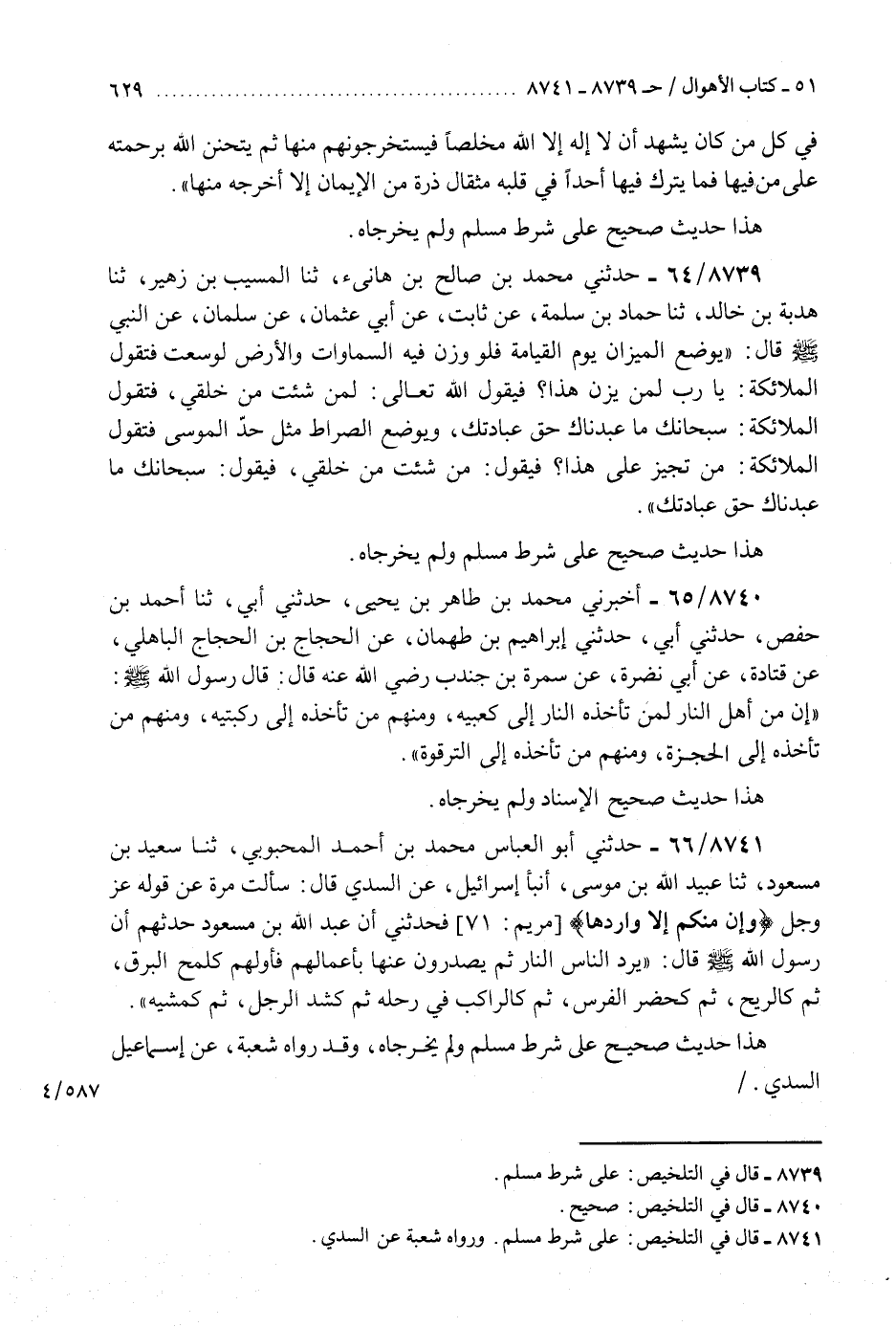 8741 - حَدَّثَنِي أَبُو الْعَبَّاسِ مُحَمَّدُ بْنُ أَحْمَدَ الْمَحْبُوبِيُّ، ثَنَا سَعِيدُ بْنُ مَسْعُودٍ، ثَنَا عُبَيْدُ اللَّهِ بْنُ مُوسَى، أَنْبَأَ إِسْرَائِيلُ، عَنِ السُّدِّيِّ، قَالَ: سَأَلْتُ مُرَّةَ عَنْ قَوْلِهِ عَزَّ وَجَلَّ: {وَإِنْ مِنْكُمْ إِلَّا وَارِدُهَا} [مريم: 71] فَحَدَّثَنِي أَنَّ عَبْدَ اللَّهِ بْنَ مَسْعُودٍ حَدَّثَهُمْ أَنَّ رَسُولَ اللَّهِ صَلَّى اللهُ عَلَيْهِ وَسَلَّمَ، قَالَ: «§يَرِدُ النَّاسُ النَّارَ ثُمَّ يَصْدُرُونَ عَنْهَا بِأَعْمَالِهِمْ، فَأَوَّلُهُمْ كَلَمْحِ الْبَرْقِ، ثُمَّ كَالرِّيحِ، ثُمَّ كَحُضْرِ الْفَرَسِ، ثُمَّ كَالرَّاكِبِ فِي رَحْلِهِ، ثُمَّ كَشَدِّ الرَّجُلِ، ثُمَّ كَمَشْيِهِ» هَذَا حَدِيثٌ صَحِيحٌ عَلَى شَرْطِ مُسْلِمٍ وَلَمْ يُخْرِجَاهُ وَقَدْ رَوَاهُ شُعْبَةُ، عَنْ إِسْمَاعِيلَ السُّدِّيِّ "K8741 - على شرط مسلم