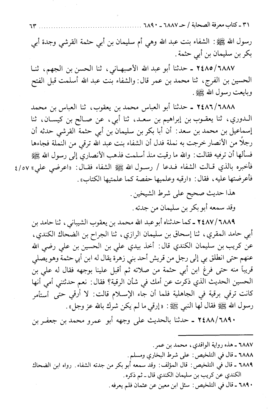 6887 - حَدَّثَنَا أَبُو عَبْدِ اللَّهِ الْأَصْبَهَانِيُّ، ثَنَا الْحَسَنُ بْنُ الْجَهْمِ، ثَنَا الْحُسَيْنُ بْنُ الْفَرَجِ، ثَنَا مُحَمَّدُ بْنُ عُمَرَ، قَالَ: «§وَالشِّفَاءُ بِنْتُ عَبْدِ اللَّهِ أَسْلَمَتْ قَبْلَ الْفَتْحِ، وَبَايَعَتْ رَسُولَ اللَّهِ صَلَّى اللهُ عَلَيْهِ وَسَلَّمَ»