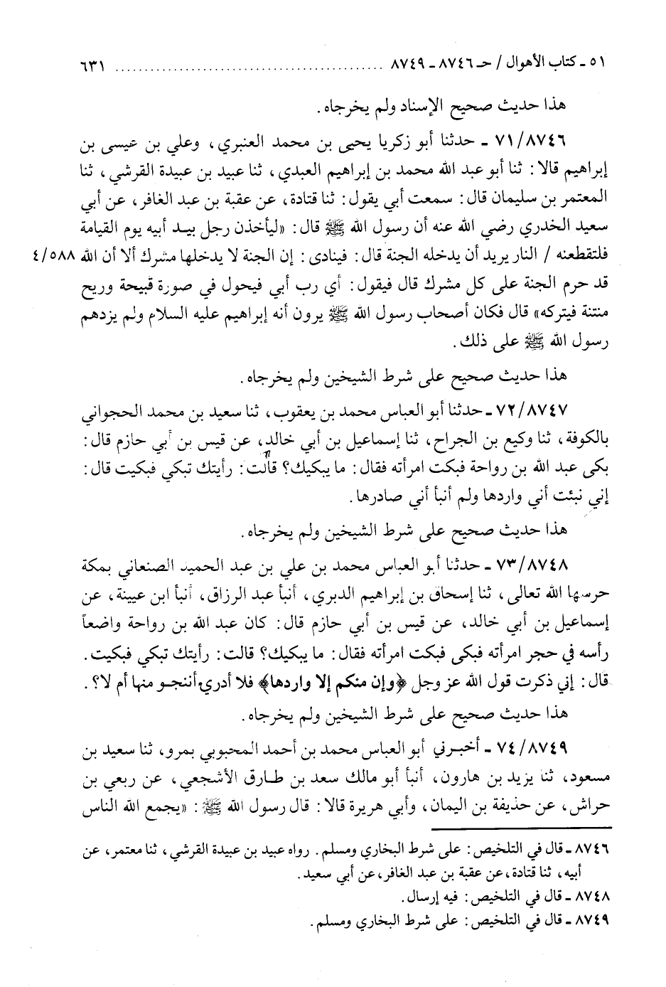8748 - حَدَّثَنَا أَبُو الْعَبَّاسِ مُحَمَّدُ بْنُ عَلِيِّ بْنِ عَبْدِ الْحَمِيدِ الصَّنْعَانِيُّ بِمَكَّةَ حَرَسَهَا اللَّهُ تَعَالَى، ثَنَا إِسْحَاقُ بْنُ إِبْرَاهِيمَ الدَّبَرِيُّ، أَنْبَأَ عَبْدُ الرَّزَّاقِ، أَنْبَأَ ابْنُ عُيَيْنَةَ، عَنْ إِسْمَاعِيلَ بْنِ أَبِي خَالِدٍ، عَنْ قَيْسِ بْنِ أَبِي حَازِمٍ، قَالَ: " كَانَ عَبْدُ اللَّهِ بْنُ رَوَاحَةَ وَاضِعًا رَأْسَهُ فِي حِجْرِ امْرَأَتِهِ فَبَكَى فَبَكَتِ امْرَأَتُهُ، فَقَالَ: مَا يُبْكِيكِ؟ قَالَتْ: رَأَيْتُكَ تَبْكِي فَبَكَيْتُ، قَالَ: إِنِّي ذَكَرْتُ قَوْلَ اللَّهِ عَزَّ وَجَلَّ: {§وَإِنْ مِنْكُمْ إِلَّا وَارِدُهَا} [مريم: 71] فَلَا أَدْرِي أَنَنْجُو مِنْهَا أَمْ لَا «هَذَا حَدِيثٌ صَحِيحٌ عَلَى شَرْطِ الشَّيْخَيْنِ وَلَمْ يُخْرِجَاهُ» K8748 - فيه إرسال