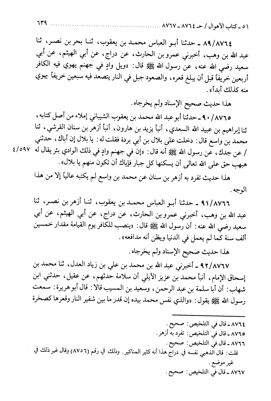 8764 - حَدَّثَنَا أَبُو الْعَبَّاسِ مُحَمَّدُ بْنُ يَعْقُوبَ، ثَنَا بَحْرُ بْنُ نَصْرٍ، ثَنَا عَبْدُ اللَّهِ بْنُ وَهْبٍ، أَخْبَرَنِي عَمْرُو بْنُ الْحَارِثِ، عَنْ دَرَّاجٍ، عَنْ أَبِي الْهَيْثَمِ، عَنْ أَبِي سَعِيدٍ رَضِيَ اللَّهُ عَنْهُ، عَنْ رَسُولِ اللَّهِ صَلَّى اللهُ عَلَيْهِ وَسَلَّمَ، قَالَ: §«وَيْلً وَادٍ فِي جَهَنَّمَ يَهْوِي فِيهِ الْكَافِرُ أَرْبَعِينَ خَرِيفًا قَبْلَ أَنْ يَبْلُغَ قَعْرَهُ، وَالصَّعُودُ جَبَلٌ فِي النَّارِ يَتَصَعَّدُ فِيهِ سَبْعِينَ خَرِيفًا يَهْوِي مِنْهُ كَذَلِكَ أَبَدًا» هَذَا حَدِيثٌ صَحِيحٌ الْإِسْنَادِ وَلَمْ يُخْرِجَاهُ "K8764 - صحيح