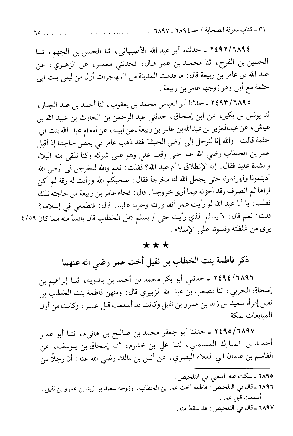 6896 - حَدَّثَنِي أَبُو بَكْرٍ مُحَمَّدُ بْنُ أَحْمَدَ بْنِ بَالَوَيْهِ، ثَنَا إِبْرَاهِيمُ بْنُ إِسْحَاقَ الْحَرْبِيُّ، ثَنَا مُصْعَبُ بْنُ عَبْدِ اللَّهِ الزُّبَيْرِيُّ، قَالَ: «وَمِنْهُنَّ §فَاطِمَةُ بِنْتُ الْخَطَّابِ بْنِ نُفَيْلٍ امْرَأَةُ سَعِيدِ بْنِ زَيْدِ بْنِ عَمْرِو بْنِ نُفَيْلٍ، وَكَانَتْ قَدْ أَسْلَمَتْ قَبْلَ عُمَرَ، وَكَانَتْ مِنْ أَوَّلِ الْمُبَايِعَاتِ بِمَكَّةَ»