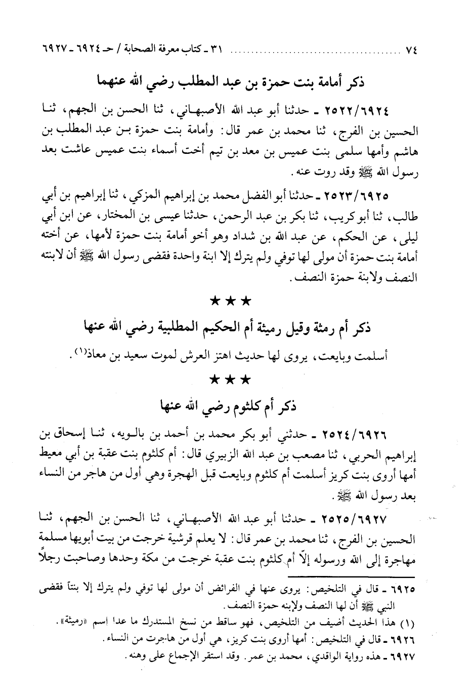 6926 - حَدَّثَنِي أَبُو بَكْرٍ مُحَمَّدُ بْنُ أَحْمَدَ بْنِ بَالَوَيْهِ، ثَنَا إِسْحَاقُ بْنُ إِبْرَاهِيمَ الْحَرْبِيُّ، ثَنَا مُصْعَبُ بْنُ عَبْدِ اللَّهِ الزُّبَيْرِيُّ، قَالَ: §«أُمُّ كُلْثُومٍ بِنْتُ عُقْبَةَ بْنِ أَبِي مُعَيْطٍ أُمُّهَا أَرْوَى بِنْتُ كَرِيزٍ أَسْلَمَتْ أُمُّ كُلْثُومٍ وَبَايَعَتْ قَبْلَ الْهِجْرَةِ وَهِيَ أَوَّلُ مَنْ هَاجَرَ مِنَ النِّسَاءِ بَعْدَ رَسُولِ اللَّهِ صَلَّى اللهُ عَلَيْهِ وَسَلَّمَ»