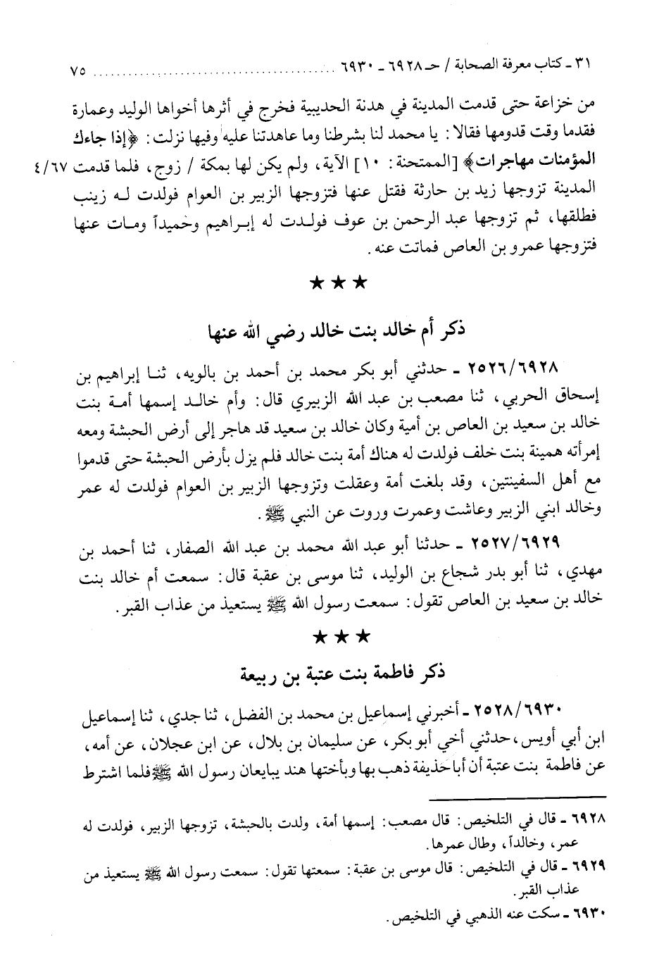 6928 - حَدَّثَنِي أَبُو بَكْرٍ مُحَمَّدُ بْنُ أَحْمَدَ بْنِ بَالَوَيْهِ، ثَنَا إِبْرَاهِيمُ بْنُ إِسْحَاقَ الْحَرْبِيُّ، ثَنَا مُصْعَبُ بْنُ عَبْدِ اللَّهِ الزُّبَيْرِيُّ، قَالَ: §«وَأُمُّ خَالِدٍ اسْمُهَا أَمَةُ بِنْتُ خَالِدِ بْنِ سَعِيدِ بْنِ الْعَاصِ بْنِ أُمَيَّةَ وَكَانَ خَالِدُ بْنُ سَعِيدٍ قَدْ هَاجَرَ إِلَى أَرْضِ الْحَبَشَةِ وَمَعَهُ امْرَأَتَهُ هُمَيْنَةُ بِنْتُ خَلَفٍ فَوَلَدَتْ لَهُ هُنَاكَ أَمَةَ بِنْتَ خَالِدٍ فَلَمْ يَزَلْ بِأَرْضِ الْحَبَشَةِ حَتَّى قَدِمُوا مَعَ أَهْلِ السَّفِينَتَيْنِ، وَقَدْ بَلَغَتْ أَمَةُ وَعَقَلَتْ وَتَزَوَّجَهَا الزُّبَيْرُ بْنُ الْعَوَّامِ فَوَلَدَتْ لَهُ عُمَرَ وَخَالِدًا ابْنَيِ الزُّبَيْرِ وَعَاشَتْ وَعَمَّرَتْ وَرَوَتْ عَنِ النَّبِيِّ صَلَّى اللهُ عَلَيْهِ وَسَلَّمَ»