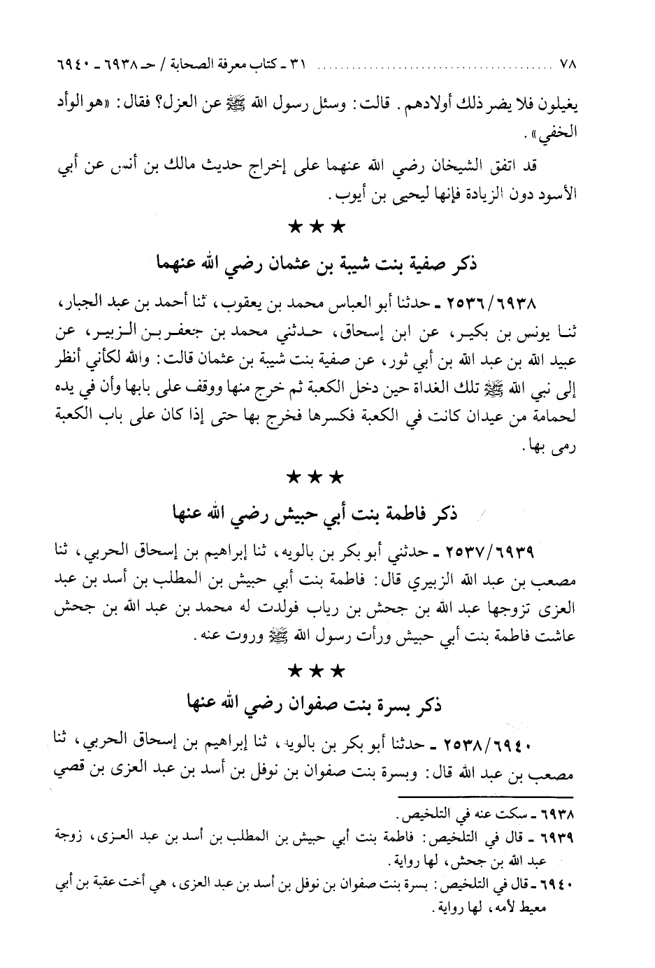 6939 - حَدَّثَنِي أَبُو بَكْرِ بْنُ بَالَوَيْهِ، ثَنَا إِبْرَاهِيمُ بْنُ إِسْحَاقَ الْحَرْبِيُّ، ثَنَا مُصْعَبُ بْنُ عَبْدِ اللَّهِ الزُّبَيْرِيُّ، قَالَ: §«فَاطِمَةُ بِنْتُ أَبِي حُبَيْشِ بْنِ الْمُطَّلِبِ بْنِ أَسَدِ بْنِ عَبْدِ الْعُزَّى تَزَوَّجَهَا عَبْدُ اللَّهِ بْنُ جَحْشِ بْنِ رِيَابٍ فَوَلَدَتْ لَهُ مُحَمَّدَ بْنَ عَبْدِ اللَّهِ بْنِ جَحْشٍ عَاشَتْ فَاطِمَةُ بِنْتُ أَبِي حُبَيْشٍ وَرَأَتْ رَسُولَ اللَّهِ صَلَّى اللهُ عَلَيْهِ وَسَلَّمَ وَرَوَتْ عَنْهُ»