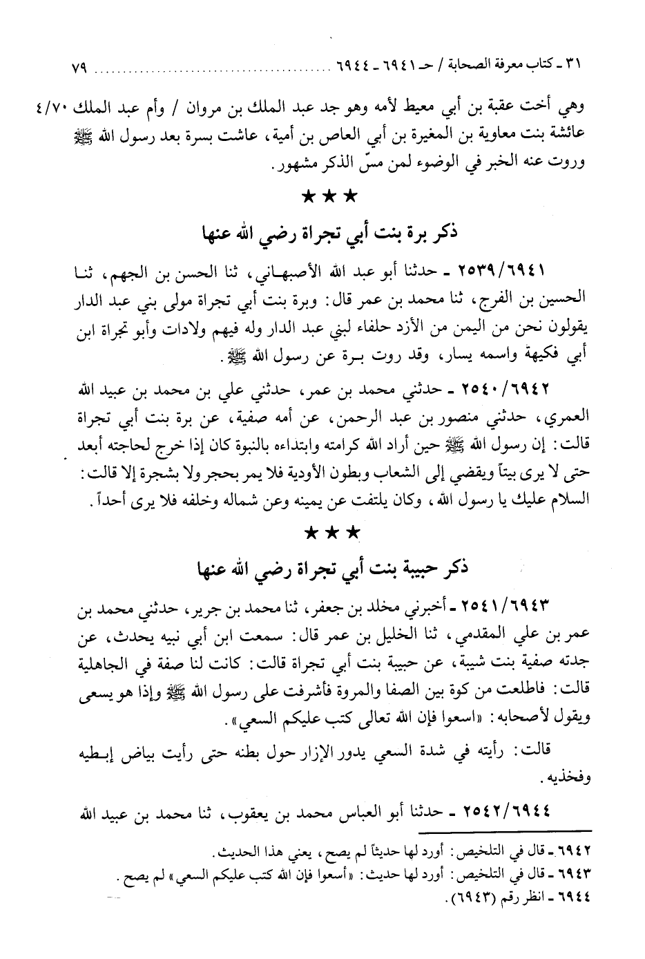 6943 - أَخْبَرَنِي مَخْلَدُ بْنُ جَعْفَرٍ، ثَنَا مُحَمَّدُ بْنُ جَرِيرٍ، حَدَّثَنِي مُحَمَّدُ بْنُ عُمَرَ بْنِ عَلِيٍّ الْمُقَدَّمِيُّ، ثَنَا الْخَلِيلُ بْنُ عُمَرَ، قَالَ: سَمِعْتُ ابْنَ أَبِي نُبَيْهٍ، يُحَدِّثُ عَنْ جَدَّتِهِ صَفِيَّةَ بِنْتِ شَيْبَةَ، عَنْ حَبِيبَةَ بِنْتِ أَبِي تَجْرَاةٍ، قَالَتْ: كَانَتْ لَنَا صُفَّةٌ فِي الْجَاهِلِيَّةِ قَالَتْ: فَاطَّلَعْتُ مِنْ كَوَّةٍ بَيْنَ الصَّفَا وَالْمَرْوَةِ فَأَشْرَفْتُ عَلَى رَسُولِ اللَّهِ صَلَّى اللهُ عَلَيْهِ وَسَلَّمَ وَإِذَا هُوَ يَسْعَى وَيَقُولُ لِأَصْحَابِهِ: «§اسْعَوْا فَإِنَّ اللَّهَ تَعَالَى كَتَبَ عَلَيْكُمُ السَّعْيَ» قَالَتْ: رَأَيْتُهُ فِي شِدَّةِ السَّعْيِ يُدَوِّرُ الْإِزَارَ حَوْلَ بَطْنِهِ حَتَّى رَأَيْتُ بَيَاضَ إِبْطَيْهِ وَفَخِذَيْهِK6943 - لم يصح