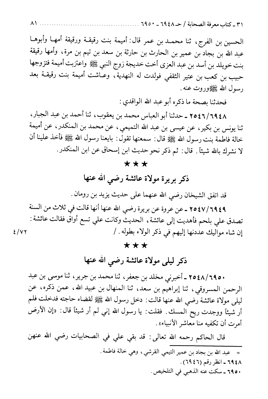 6950 - أَخْبَرَنِي مَخْلَدُ بْنُ جَعْفَرٍ، ثَنَا مُحَمَّدُ بْنُ جَرِيرٍ، ثَنَا مُوسَى بْنُ عَبْدِ الرَّحْمَنِ الْمَسْرُوقِيُّ، ثَنَا إِبْرَاهِيمُ بْنُ سَعْدٍ، ثَنَا الْمِنْهَالُ بْنُ عُبَيْدِ اللَّهِ، عَمَّنْ ذَكَرَهُ، عَنْ لَيْلَى، مَوْلَاةِ عَائِشَةَ رَضِيَ اللَّهُ عَنْهَا قَالَتْ: دَخَلَ رَسُولُ اللَّهِ صَلَّى اللهُ عَلَيْهِ وَسَلَّمَ لِقَضَاءِ حَاجَتِهِ فَدَخَلْتُ فَلَمْ أَرَ شَيْئًا وَوَجَدْتُ رِيحَ الْمِسْكِ. فَقُلْتُ: يَا رَسُولَ اللَّهِ إِنِّي لَمْ أَرَ شَيْئًا قَالَ: «إِنَّ §الْأَرْضَ أُمِرْتْ أَنْ تَكْفِيَهُ مِنَّا مَعَاشِرَ الْأَنْبِيَاءِ» قَالَ الْحَاكِمُ رَحِمَهُ اللَّهُ تَعَالَى: «قَدْ بَقِيَ عَلَيَّ فِي الصَّحَابِيَّاتِ رَضِيَ اللَّهُ عَنْهُنَّ جَمَاعَةٌ لَمْ أَذْكُرْهُنَّ إِيثَارًا لِلتَّخْفِيفِ وَخَشْيَةَ تَطْوِيلِ الْكِتَابِ، وَأَيْضًا فَإِنِّي تَرْجَمْتُ كِتَابَ الصَّحَابَةِ لِلْفَضَائِلِ وَلَسْتُ أَجِدُ الْفَضَائِلَ بَعْدَ أَزْوَاجِ رَسُولِ اللَّهِ صَلَّى اللهُ عَلَيْهِ وَسَلَّمَ إِلَّا لِبَعْضِهِنَّ، فَاسْتَخَرْتُ اللَّهَ سُبْحَانَهُ وَتَعَالَى وَجَعَلْتُ آخِرَ الْكِتَابِ كِتَابَ مَنَاقِبِ الصَّحَابَةِ رَضِيَ اللَّهُ عَنْهُمْ أَجْمَعِينَ» K6950 - سكت عنه الذهبي في التلخيص