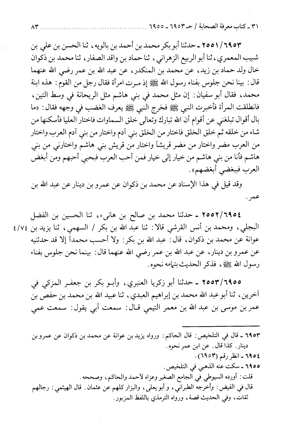 6953 - حَدَّثَنَا أَبُو بَكْرٍ مُحَمَّدُ بْنُ أَحْمَدَ بْنِ بَالَوَيْهِ، ثَنَا الْحَسَنُ بْنُ عَلِيِّ بْنِ شَبِيبٍ الْمَعْمَرِيُّ، ثَنَا أَبُو الرَّبِيعِ الزَّهْرَانِيُّ، ثَنَا حَمَّادُ بْنُ وَاقِدٍ الصَّفَّارُ، ثَنَا مُحَمَّدُ بْنُ ذَكْوَانَ، خَالُ وَلَدِ حَمَّادِ بْنِ زَيْدٍ، عَنْ مُحَمَّدِ بْنِ الْمُنْكَدِرِ، عَنْ عَبْدِ اللَّهِ بْنِ عُمَرَ، رَضِيَ اللَّهُ عَنْهُمَا قَالَ: بَيْنَا نَحْنُ جُلُوسٌ بِفِنَاءِ رَسُولِ اللَّهِ صَلَّى اللهُ عَلَيْهِ وَسَلَّمَ إِذْ مَرَّتِ امْرَأَةٌ، فَقَالَ رَجُلٌ مِنَ الْقَوْمِ: هَذِهِ ابْنَةُ مُحَمَّدٍ، فَقَالَ أَبُو سُفْيَانَ: إِنَّ مَثَلَ مُحَمَّدٍ فِي بَنِي هَاشِمٍ مَثَلُ الرَّيْحَانَةِ فِي وَسَطِ التِّينِ، فَانْطَلَقَتِ الْمَرْأَةُ فَأَخْبَرَتِ النَّبِيَّ صَلَّى اللهُ عَلَيْهِ وَسَلَّمَ، فَخَرَجَ النَّبِيُّ صَلَّى اللهُ عَلَيْهِ وَسَلَّمَ يُعْرَفُ الْغَضَبُ فِي وَجْهِهِ فَقَالَ: «مَا بَالُ أَقْوَالٍ تَبْلُغُنِي عَنْ أَقْوَامٍ إِنَّ §اللَّهَ تَبَارَكَ وَتَعَالَى خَلَقَ السَّمَاوَاتِ، فَاخْتَارَ الْعُلْيَا فَأَسْكَنْهَا مَنْ شَاءَ مِنْ خَلْقِهِ، ثُمَّ خَلَقَ الْخَلْقَ فَاخْتَارَ مِنَ الْخَلْقِ بَنِي آدَمَ وَاخْتَارَ مِنْ بَنِي آدَمَ الْعَرَبَ، وَاخْتَارَ مِنَ الْعَرَبِ مُضَرَ، وَاخْتَارَ مِنْ مُضَرَ قُرَيْشًا، وَاخْتَارَ مِنْ قُرَيْشٍ بَنِي هَاشِمٍ، وَاخْتَارَنِي مِنْ بَنِي هَاشِمٍ، فَأَنَا مِنْ بَنِي هَاشِمٍ مِنْ خِيَارٍ إِلَى خِيَارٍ، فَمَنْ أَحَبَّ الْعَرَبَ فَبِحُبِّي أَحَبَّهُمْ، وَمَنْ أَبْغَضَ الْعَرَبَ فَبِبُغْضِي أَبْغَضَهُمْ» وَقَدْ قِيلَ فِي هَذَا الْإِسْنَادِ عَنْ مُحَمَّدِ بْنِ ذَكْوَانَ، عَنْ عَمْرِو بْنِ دِينَارٍ، عَنْ عَبْدِ اللَّهِ بْنِ عُمَرَ،