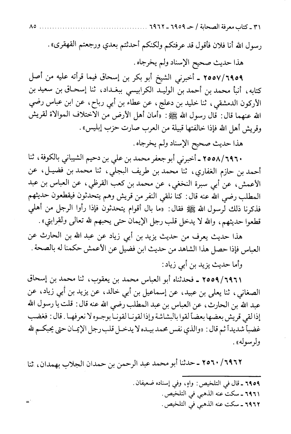 6960 - أَخْبَرَنِي أَبُو جَعْفَرٍ مُحَمَّدُ بْنُ عَلِيِّ بْنِ دُحَيْمٍ الشَّيْبَانِيُّ، بِالْكُوفَةِ، ثَنَا أَحْمَدُ بْنُ حَازِمٍ الْغِفَارِيُّ، ثَنَا مُحَمَّدُ بْنُ طَرِيفٍ الْبَجَلِيُّ، ثَنَا مُحَمَّدُ بْنُ فُضَيْلٍ، عَنِ الْأَعْمَشِ، عَنْ أَبِي سَبْرَةَ النَّخَعِيِّ، عَنْ مُحَمَّدِ بْنِ كَعْبٍ الْقُرَظِيِّ، عَنِ الْعَبَّاسِ بْنِ عَبْدِ الْمُطَّلِبِ، رَضِيَ اللَّهُ عَنْهُ قَالَ: كُنَّا نَلْقَى النَّفَرَ مِنْ قُرَيْشٍ وَهُمْ يَتَحَدَّثُونَ فَيَقْطَعُونَ حَدِيثَهُمْ، فَذَكَرْنَا ذَلِكَ لِرَسُولِ اللَّهِ صَلَّى اللهُ عَلَيْهِ وَسَلَّمَ فَقَالَ: §«مَا بَالُ أَقْوَامٍ يَتَحَدَّثُونَ فَإِذَا رَأَوُا الرَّجُلَ مِنْ أَهْلِي قَطَعُوا حَدِيثَهُمْ، وَاللَّهِ لَا يَدْخُلُ قَلْبَ رَجُلٍ الْإِيمَانُ حَتَّى يُحِبَّهُمْ لِلَّهِ تَعَالَى وَلِقَرَابَتِي» هَذَا حَدِيثٌ يُعْرَفُ مِنْ حَدِيثِ يَزِيدَ بْنِ أَبِي زِيَادٍ، عَنْ عَبْدِ اللَّهِ بْنِ الْحَارِثِ، عَنِ الْعَبَّاسِ فَإِذَا حَصَلَ هَذَا الشَّاهِدُ مِنْ حَدِيثِ ابْنِ فُضَيْلٍ، عَنِ الْأَعْمَشِ حَكَمْنَا لَهُ بِالصِّحَّةِ، وَأَمَّا حَدِيثُ يَزِيدَ بْنِ أَبِي زِيَادٍ "