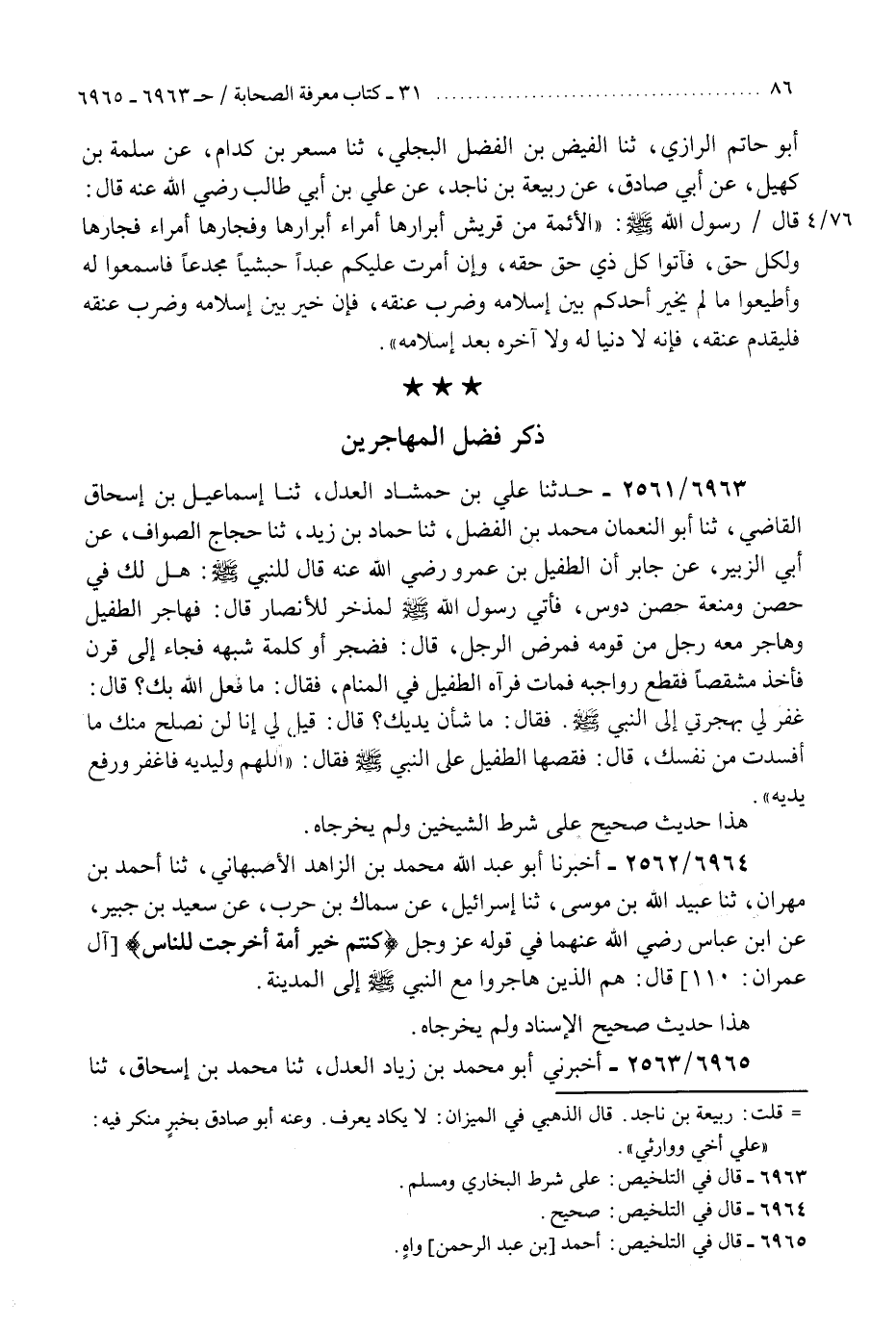 6963 - حَدَّثَنَا عَلِيُّ بْنُ حَمْشَاذَ الْعَدْلُ، ثَنَا إِسْمَاعِيلُ بْنُ إِسْحَاقَ الْقَاضِي، ثَنَا أَبُو النُّعْمَانِ مُحَمَّدُ بْنُ الْفَضْلِ، ثَنَا حَمَّادُ بْنُ زَيْدٍ، ثَنَا حَجَّاجٌ الصَّوَّافُ، عَنْ أَبِي الزُّبَيْرِ، عَنْ جَابِرٍ، أَنَّ الطُّفَيْلَ بْنَ عَمْرٍو رَضِيَ اللَّهُ عَنْهُ قَالَ لِلنَّبِيِّ صَلَّى اللهُ عَلَيْهِ وَسَلَّمَ: هَلْ لَكَ فِي حِصْنٍ وَمَنَعَةِ حِصْنِ دَوْسٍ، فَأَتَى رَسُولُ اللَّهِ صَلَّى اللهُ عَلَيْهِ وَسَلَّمَ لِمِذْخَرٍ لِلْأَنْصَارِ قَالَ: فَهَاجَرَ الطُّفَيْلُ وَهَاجَرَ مَعَهُ رَجُلٌ مِنْ قَوْمِهِ فَمَرِضَ الرَّجُلُ - قَالَ: فَضَجِرَ أَوْ كَلِمَةً شَبَهَهُ - فَجَاءَ إِلَى قَرْنٍ، فَأَخَذَ مِشْقَصًا، فَقَطَعَ رَوَاجِبَهُ فَمَاتَ، فَرَآهُ الطُّفَيْلُ فِي الْمَنَامِ، فَقَالَ: مَا فَعَلَ اللَّهُ بِكَ؟ قَالَ: غَفَرَ لِي بِهِجْرَتِي إِلَى النَّبِيِّ صَلَّى اللهُ عَلَيْهِ وَسَلَّمَ فَقَالَ: مَا شَأْنُ يَدَيْكَ؟ قَالَ: قِيلَ لِي: إِنَّا لَنْ نُصْلِحَ مِنْكَ مَا أَفْسَدْتَ مِنْ نَفْسِكَ، قَالَ: فَقَصَّهَا الطُّفَيْلُ عَلَى النَّبِيِّ صَلَّى اللهُ عَلَيْهِ وَسَلَّمَ، فَقَالَ: §«اللَّهُمَّ وَلِيَدَيْهِ فَاغْفِرْ» وَرَفَعَ يَدَيْهِ «هَذَا حَدِيثٌ صَحِيحٌ عَلَى شَرْطِ الشَّيْخَيْنِ وَلَمْ يُخَرِّجَاهُ» K6963 - على شرط البخاري ومسلم