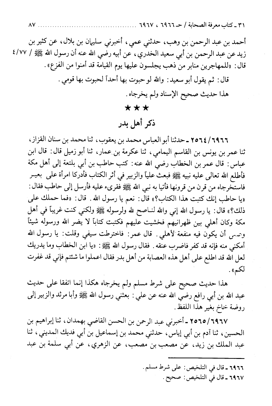 6966 - حَدَّثَنَا أَبُو الْعَبَّاسِ مُحَمَّدُ بْنُ يَعْقُوبَ، ثَنَا مُحَمَّدُ بْنُ سِنَانٍ الْقَزَّازُ، ثَنَا عُمَرُ بْنُ يُونُسَ بْنِ الْقَاسِمِ الْيَمَامِيُّ، ثَنَا عِكْرِمَةُ بْنُ عَمَّارٍ، ثَنَا أَبُو زُمَيْلٍ، قَالَ: قَالَ ابْنُ عَبَّاسٍ: قَالَ عُمَرُ بْنُ الْخَطَّابِ رَضِيَ اللَّهُ عَنْهُ: كَتَبَ حَاطِبُ بْنُ أَبِي بَلْتَعَةَ إِلَى أَهْلِ مَكَّةَ فَأَطْلَعَ اللَّهُ تَعَالَى عَلَيْهِ نَبِيَّهُ صَلَّى اللهُ عَلَيْهِ وَسَلَّمَ، فَبَعَثَ عَلِيًّا وَالزُّبَيْرَ فِي أَثَرِ الْكِتَابِ فَأَدْرَكَا امْرَأَةً عَلَى بَعِيرٍ فَاسْتَخْرَجَاهُ مِنْ قَرْنٍ مِنْ قُرُونِهَا، فَأَتَيَا بِهِ نَبِيَّ اللَّهِ صَلَّى اللهُ عَلَيْهِ وَسَلَّمَ فَقُرِئَ عَلَيْهِ فَأَرْسَلَ إِلَى حَاطِبٍ فَقَالَ: «يَا حَاطِبُ، إِنَّكَ كَتَبْتُ هَذَا الْكِتَابَ؟» قَالَ: نَعَمْ يَا رَسُولَ اللَّهِ، قَالَ: فَمَا حَمَلَكَ عَلَى ذَلِكَ؟ قَالَ: يَا رَسُولَ اللَّهِ، إِنِّي وَاللَّهِ لَنَاصِحٌ لِلَّهِ وَلِرَسُولِهِ صَلَّى اللهُ عَلَيْهِ وَسَلَّمَ وَلَكِنِّي كُنْتُ غَرِيبًا فِي أَهْلِ مَكَّةَ وَكَانَ أَهْلِي بَيْنَ ظَهْرَانَيْهِمْ فَخَشِيتُ عَلَيْهِمْ، فَكَتَبْتُ كِتَابًا لَا يَضُرُّ اللَّهَ وَرَسُولَهُ شَيْئًا، وَعَسَى أَنْ يَكُونَ فِيهِ مَنْفَعَةٌ لِأَهْلِي قَالَ عُمَرُ: فَاخْتَرَطْتُ سَيْفِي وَقُلْتُ: يَا رَسُولَ اللَّهِ، أَمْكِنِّي مِنْهُ فَإِنَّهُ قَدْ كَفَرَ، فَأَضْرِبْ عُنُقَهُ، فَقَالَ رَسُولُ اللَّهِ صَلَّى اللهُ عَلَيْهِ وَسَلَّمَ: " يَا ابْنَ الْخَطَّابِ، وَمَا يُدْرِيكَ لَعَلَّ اللَّهَ قَدِ اطَّلَعَ عَلَى أَهْلِ هَذِهِ الْعِصَابَةِ مِنْ أَهْلِ بَدْرٍ فَقَالَ: §اعْمَلُوا مَا شِئْتُمْ فَإِنِّي قَدْ غَفَرْتُ لَكُمْ «هَذَا حَدِيثٌ صَحِيحٌ عَلَى شَرْطِ مُسْلِمٍ وَلَمْ يُخَرِّجَاهُ هَكَذَا، إِنَّمَا اتَّفَقَا عَلَى حَدِيثِ عَبْدِ اللَّهِ بْنِ أَبِي رَافِعٍ رَضِيَ اللَّهُ عَنْهُ، عَنْ عَلِيٍّ بَعَثَنِي رَسُولُ اللَّهِ صَلَّى اللهُ عَلَيْهِ وَسَلَّمَ وَأَبَا مَرْثَدٍ وَالزُّبَيْرَ إِلَى رَوْضَةَ خَاخٍ بِغَيْرِ هَذَا اللَّفْظِ» K6966 - على شرط مسلم