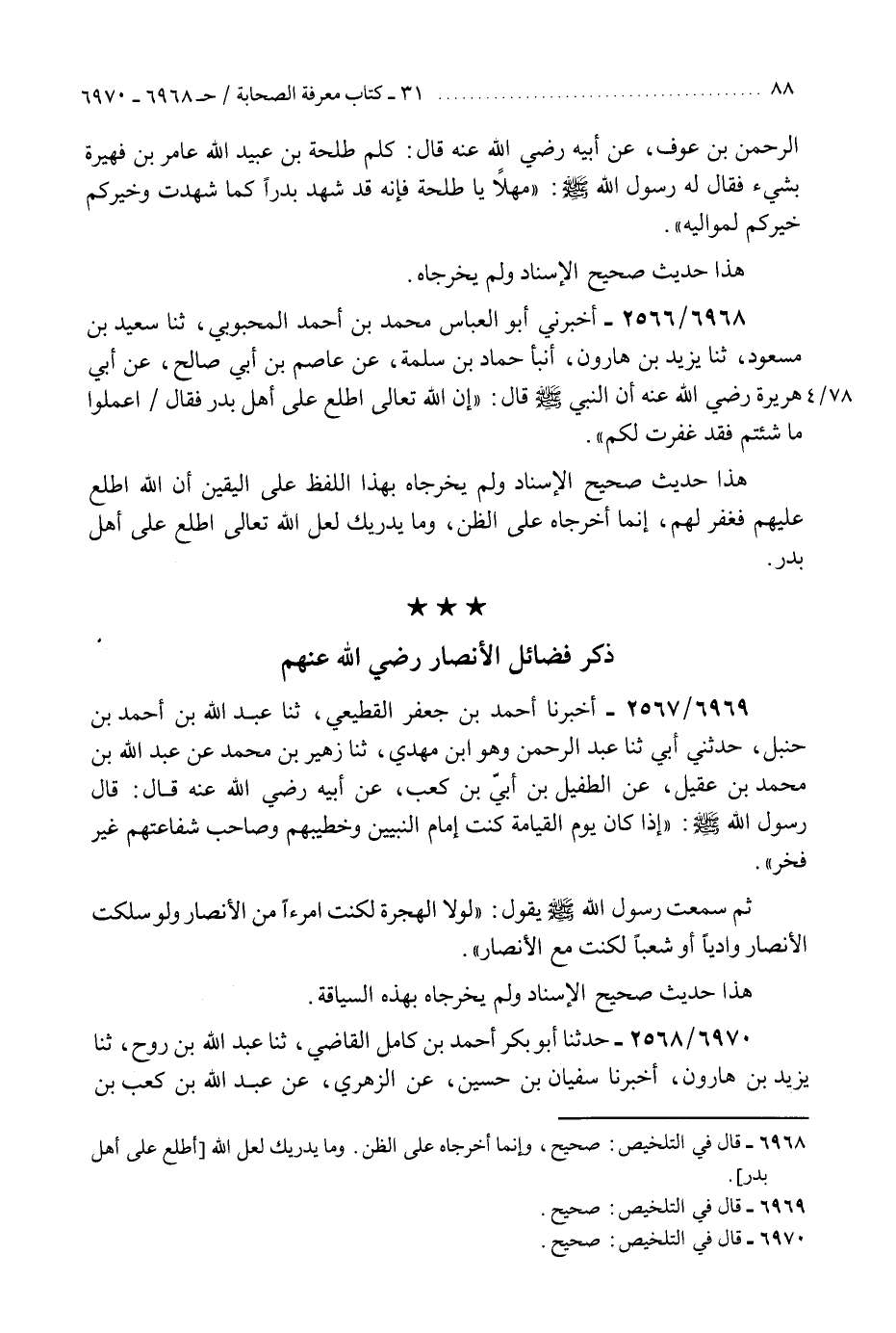 6968 - أَخْبَرَنِي أَبُو الْعَبَّاسِ مُحَمَّدُ بْنُ أَحْمَدَ الْمَحْبُوبِيُّ، ثَنَا سَعِيدُ بْنُ مَسْعُودٍ، ثَنَا يَزِيدُ بْنُ هَارُونَ، أَنْبَأَ حَمَّادُ بْنُ سَلَمَةَ، عَنْ عَاصِمِ بْنِ أَبِي صَالِحٍ، عَنْ أَبِي هُرَيْرَةَ رَضِيَ اللَّهُ عَنْهُ، أَنَّ النَّبِيَّ صَلَّى اللهُ عَلَيْهِ وَسَلَّمَ قَالَ: " إِنَّ اللَّهَ تَعَالَى اطَّلَعَ عَلَى أَهْلِ بَدْرٍ، فَقَالَ: §اعْمَلُوا مَا شِئْتُمْ فَقَدْ غَفَرْتُ لَكُمْ «هَذَا حَدِيثٌ صَحِيحُ الْإِسْنَادِ وَلَمْ يُخَرِّجَاهُ بِهَذَا اللَّفْظِ عَلَى الْيَقِينِ أَنَّ اللَّهَ اطَّلَعَ عَلَيْهِمْ فَغَفَرَ لَهُمْ، إِنَّمَا أَخْرَجَاهُ عَلَى الظَّنِّ وَمَا يُدْرِيكَ لَعَلَّ اللَّهَ تَعَالَى اطَّلَعَ عَلَى أَهْلِ بَدْرٍ» K6968 - صحيح