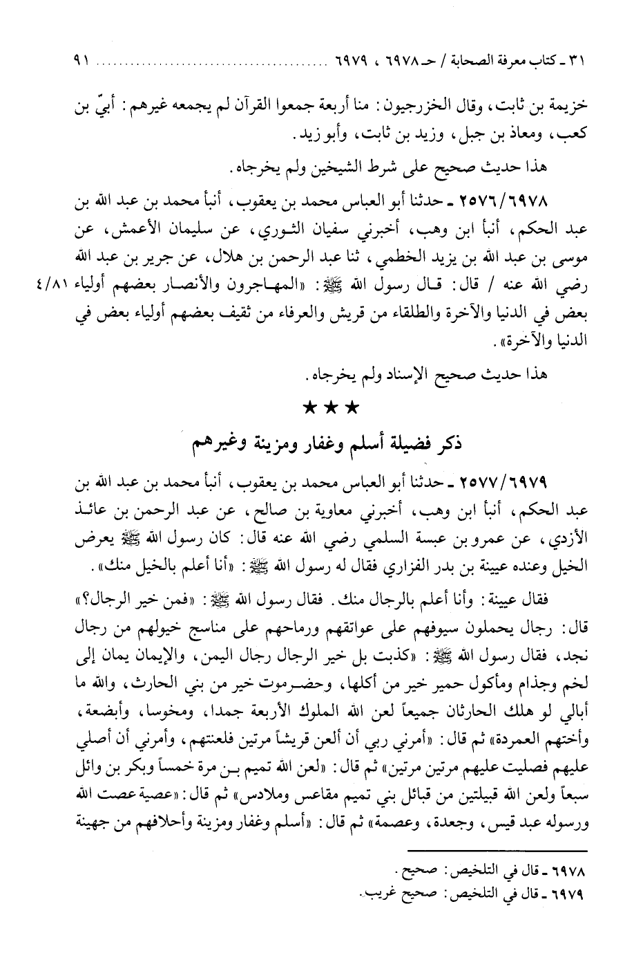6979 - حَدَّثَنَا أَبُو الْعَبَّاسِ مُحَمَّدُ بْنُ يَعْقُوبَ أَنْبَأَ مُحَمَّدُ بْنُ عَبْدِ اللَّهِ بْنِ عَبْدِ الْحَكَمِ، أَنْبَأَ ابْنُ وَهْبٍ، أَخْبَرَنِي مُعَاوِيَةُ بْنُ صَالِحٍ، عَنْ عَبْدِ الرَّحْمَنِ بْنِ عَائِذٍ الْأَزْدِيِّ، عَنْ عَمْرِو بْنِ عَبَسَةَ السُّلَمِيِّ رَضِيَ اللَّهُ عَنْهُ قَالَ: كَانَ رَسُولُ اللَّهِ صَلَّى اللهُ عَلَيْهِ وَسَلَّمَ يَعْرِضُ الْخَيْلَ وَعِنْدَهُ عُيَيْنَةُ بْنُ بَدْرِ الْفَزَارِيُّ، فَقَالَ لَهُ رَسُولُ اللَّهِ صَلَّى اللهُ عَلَيْهِ وَسَلَّمَ: «أَنَا أَعْلَمُ بِالْخَيْلِ مِنْكَ» . فَقَالَ عُيَيْنَةُ: وَأَنَا أَعْلَمُ بِالرِّجَالِ مِنْكَ. فَقَالَ رَسُولُ اللَّهِ صَلَّى اللهُ عَلَيْهِ وَسَلَّمَ: «فَمَنْ خَيْرٌ الرِّجَالُ؟» قَالَ: رِجَالٌ يَحْمِلُونَ سُيُوفَهُمْ عَلَى عَوَاتِقِهِمْ وَرِمَاحِهِمْ عَلَى مَنْاسِجِ خُيُولِهِمْ مِنْ رِجَالِ نَجْدٍ، فَقَالَ رَسُولُ اللَّهِ صَلَّى اللهُ عَلَيْهِ وَسَلَّمَ: " كَذَبْتَ بَلْ §خَيْرُ الرِّجَالِ رِجَالُ الْيَمَنِ، وَالْإِيمَانُ يَمَانٍ إِلَى لَخْمٍ وَجُذَامٍ، وَمَأْكُولُ حِمْيَرَ خَيْرٌ مِنْ أُكُلِهَا، وَحَضْرَمُوتُ خَيْرٌ مِنْ بَنِي الْحَارِثِ، وَاللَّهِ مَا أُبَالِي لَوْ هَلَكَ الْحَارِثَانِ جَمِيعًا، لَعَنَ اللَّهُ الْمُلُوكَ الْأَرْبَعَةَ: جَمْدًا، وَمِخْوَسًا، وَأَبْضَعَةَ، وَأُخْتَهُمُ الْعَمَرَّدَةَ " ثُمَّ قَالَ: «أَمَرَنِي رَبِّي أَنْ أَلْعَنَ قُرَيْشًا مَرَّتَيْنِ فَلَعَنْتُهُمْ، وَأَمَرَنِي أَنَّ أُصَلِّيَ عَلَيْهِمْ فَصَلَّيْتُ عَلَيْهِمْ مَرَّتَيْنِ مَرَّتَيْنِ» ، ثُمَّ قَالَ: «لَعَنَ اللَّهُ تَمِيمَ بْنَ مُرَّةَ خَمْسًا، وَبَكْرَ بْنَ وَائِلٍ سَبْعًا، وَلَعَنَ اللَّهُ قَبِيلَتَيْنِ مِنْ قَبَائِلِ بَنِي تَمِيمٍ مُقَاعِسَ وَمُلَادِسَ» ثُمَّ قَالَ: «عُصَيَّةُ عَصَتِ اللَّهَ وَرَسُولَهُ، عَبْدُ قَيْسٍ، وَجَعْدَةُ، وَعِصْمَةُ» ثُمَّ قَالَ: «أَسْلَمُ وَغِفَارٌ وَمُزَيْنَةُ وَأَحْلَافُهُمْ مِنْ جُهَيْنَةَ خَيْرٌ مِنْ بَنِي أَسَدٍ وَتَمِيمٍ وَغَطَفَانَ وَهَوَازِنَ عِنْدَ اللَّهِ يَوْمَ الْقِيَامَةِ» ثُمَّ قَالَ: «شَرُّ قَبِيلَتَيْنِ فِي الْعَرَبِ نَجْرَانَ وَبَنُو تَغْلِبَ، وَأَكْثَرُ الْقَبَائِلِ فِي الْجَنَّةِ مَذْحِجٍ» هَذَا حَدِيثٌ غَرِيبُ الْمَتْنِ صَحِيحُ الْإِسْنَادِ وَلَمْ يُخَرِّجَاهُ "K6979 - صحيح غريب