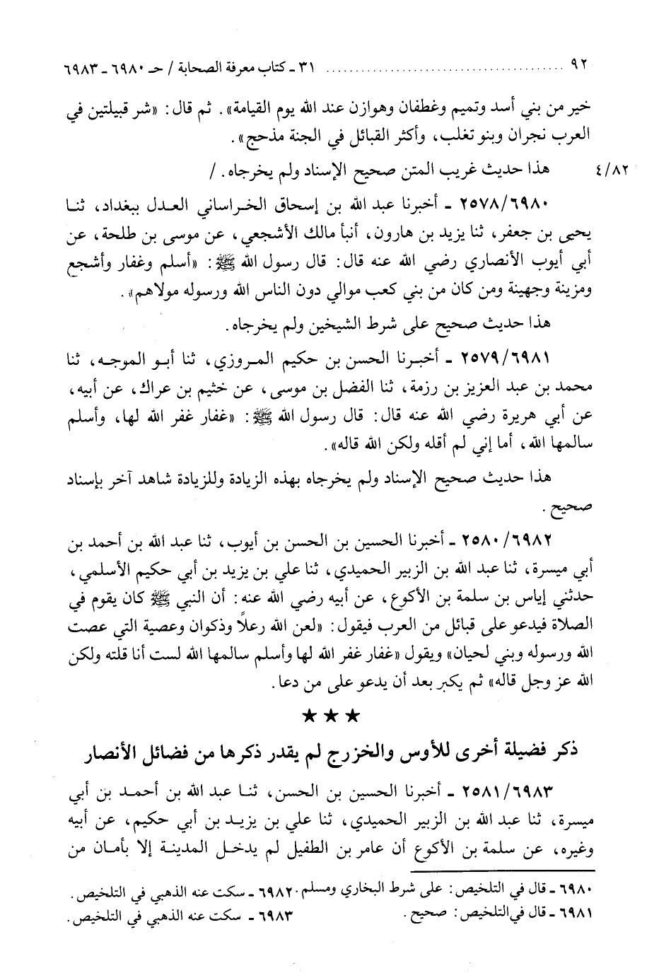 6981 - أَخْبَرَنَا الْحَسَنُ بْنُ حَلِيمٍ الْمَرْوَزِيُّ، ثَنَا أَبُو الْمُوَجِّهِ، ثَنَا مُحَمَّدُ بْنُ عَبْدِ الْعَزِيزِ بْنِ رِزْمَةَ، ثَنَا الْفَضْلُ بْنُ مُوسَى، عَنْ خُثَيْمِ بْنِ عِرَاكٍ، عَنْ أَبِيهِ، عَنْ أَبِي هُرَيْرَةَ، رَضِيَ اللَّهُ عَنْهُ قَالَ: قَالَ رَسُولُ اللَّهِ صَلَّى اللهُ عَلَيْهِ وَسَلَّمَ: «§غِفَارٌ غَفَرَ اللَّهُ لَهَا، وَأَسْلَمَ سَالَمَهَا اللَّهُ، أَمَا إِنِّي لَمْ أَقُلْهُ وَلَكِنَّ اللَّهَ قَالَهُ» هَذَا حَدِيثٌ صَحِيحُ الْإِسْنَادِ وَلَمْ يُخَرِّجَاهُ بِهَذِهِ الزِّيَادَةِ، وَلِلزِّيَادَةِ شَاهِدٌ آخَرُ بِإِسْنَادٍ صَحِيحٍK6981 - صحيح