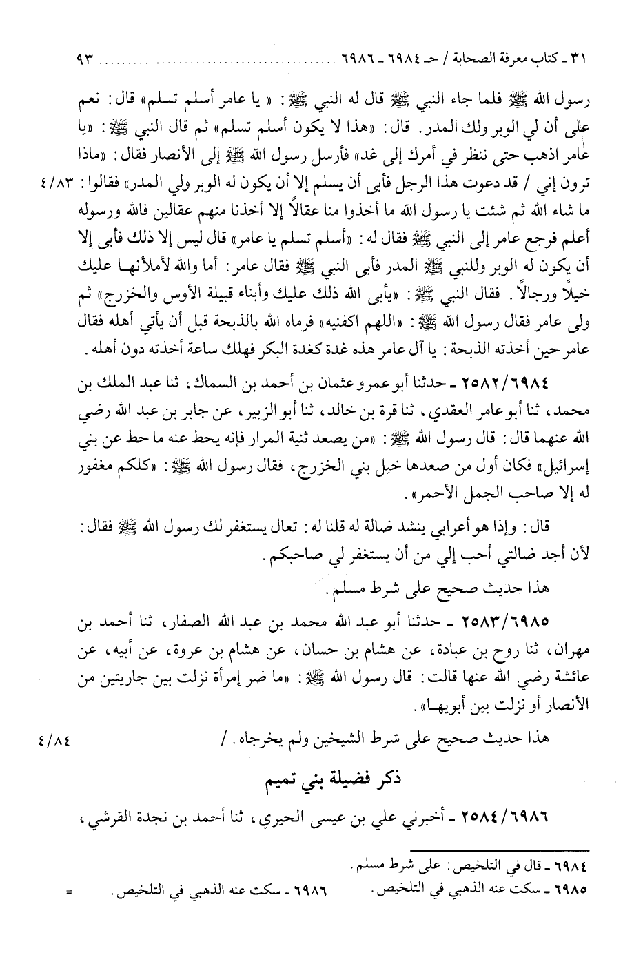 6986 - أَخْبَرَنِي عَلِيُّ بْنُ عِيسَى الْحِيرِيُّ، ثَنَا أَحْمَدُ بْنُ نَجْدَةَ الْقُرَشِيُّ، ثَنَا مَنْصُورٌ، ثَنَا مَسْلَمَةُ بْنُ عَلْقَمَةَ الْمَازِنِيُّ، عَنْ دَاودَ بْنِ أَبِي هِنْدٍ، عَنْ عَامِرٍ، عَنْ أَبِي هُرَيْرَةَ، رَضِيَ اللَّهُ عَنْهُ قَالَ: " ثَلَاثٌ سَمِعْتُهُنَّ لِبَنِي تَمِيمٍ مِنْ رَسُولِ اللَّهِ صَلَّى اللهُ عَلَيْهِ وَسَلَّمَ لَا أَبْغَضُ تَمِيمًا بَعْدَهُنَّ أَبَدًا. كَانَ عَلَى عَائِشَةَ نَذْرٌ مُحَرَّرٌ مِنْ وَلَدِ إِسْمَاعِيلَ فَسُبِيَ سَبْيٌ مِنْ بَنِي الْعَنْبَرِ فَقَالَ لِعَائِشَةَ: §إِنْ سَرَّكِ أَنْ تَفِيَ بِنَذْرِكَ فَأَعْتِقِي مُحَرَّرًا مِنْ هَؤُلَاءِ فَجَعَلَهُمْ مِنْ وَلَدِ إِسْمَاعِيلَ وَجِيءَ بِنَعَمٍ مِنْ نَعَمِ الصَّدَقَةِ لِبَنِي سَعْدٍ فَلَمَّا رَآهَا رَاعَهُ فَقَالَ: هَذِهِ، نَعَمُ قَوْمِي فَجَعَلَهُمْ قَوْمَهُ، وَقَالَ: هُمْ أَشَدُّ النَّاسِ قِتَالًا فِي الْمَلَاحِمِ «هَذَا حَدِيثٌ صَحِيحٌ عَلَى شَرْطِ مُسْلِمٍ وَلَمْ يُخَرِّجَاهُ» K6986 - سكت عنه الذهبي في التلخيص