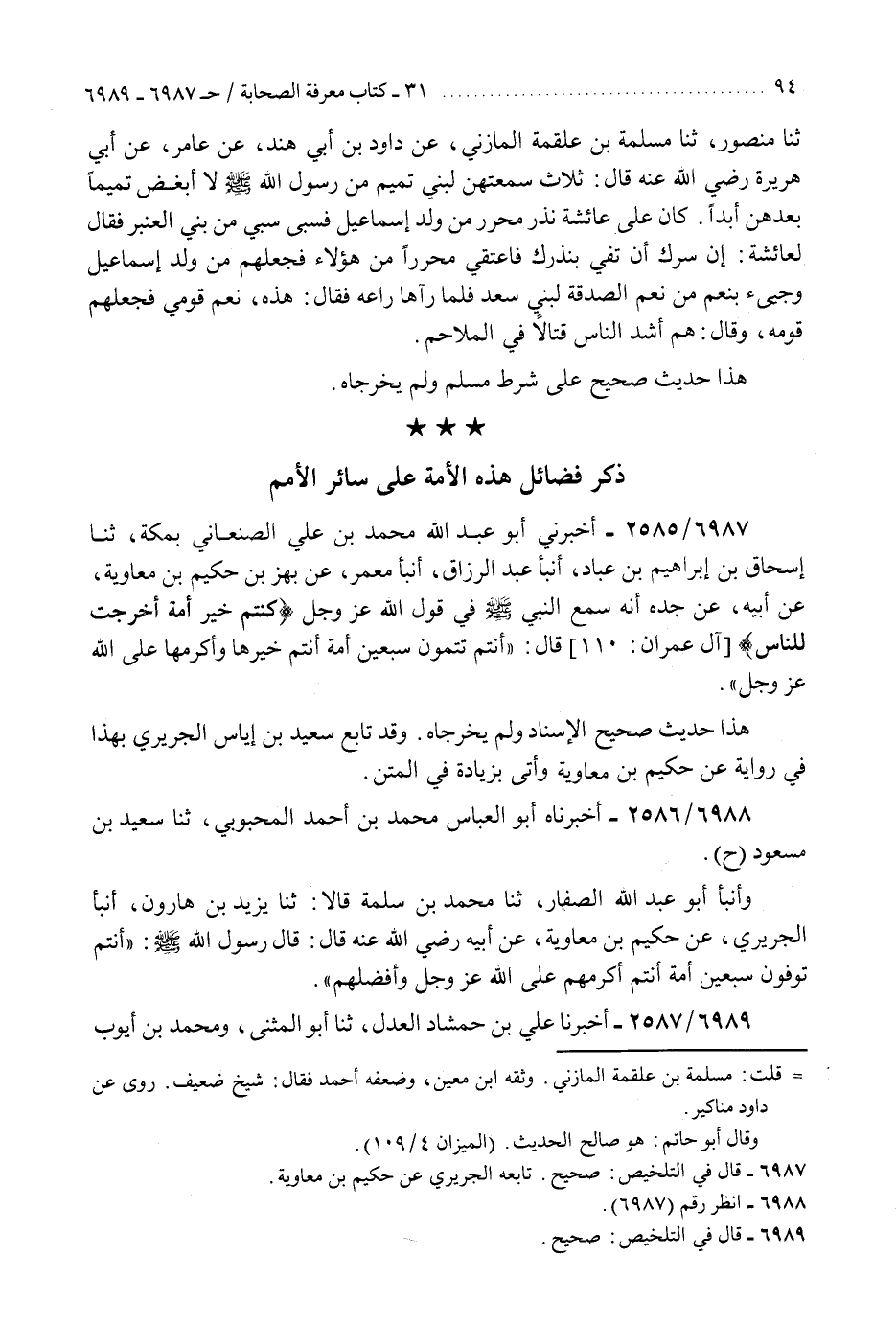 6988 - أَخْبَرَنَاهُ أَبُو الْعَبَّاسِ مُحَمَّدُ بْنُ أَحْمَدَ الْمَحْبُوبِيُّ، ثَنَا سَعِيدُ بْنُ مَسْعُودٍ، ح وَأَنْبَأَ أَبُو عَبْدِ اللَّهِ الصَّفَّارُ، ثَنَا مُحَمَّدُ بْنُ سَلَمَةَ، قَالَا: ثَنَا يَزِيدُ بْنُ هَارُونَ، أَنْبَأَ الْجُرَيْرِيُّ، عَنْ حَكِيمِ بْنِ مُعَاوِيَةَ، عَنْ أَبِيهِ رَضِيَ اللَّهُ عَنْهُ، قَالَ: قَالَ رَسُولُ اللَّهِ صَلَّى اللهُ عَلَيْهِ وَسَلَّمَ: §«أَنْتُمْ تُوفُونَ سَبْعِينَ أُمَّةً أَنْتُمْ أَكْرَمُهُمْ عَلَى اللَّهِ عَزَّ وَجَلَّ وَأَفْضَلُهُمْ»