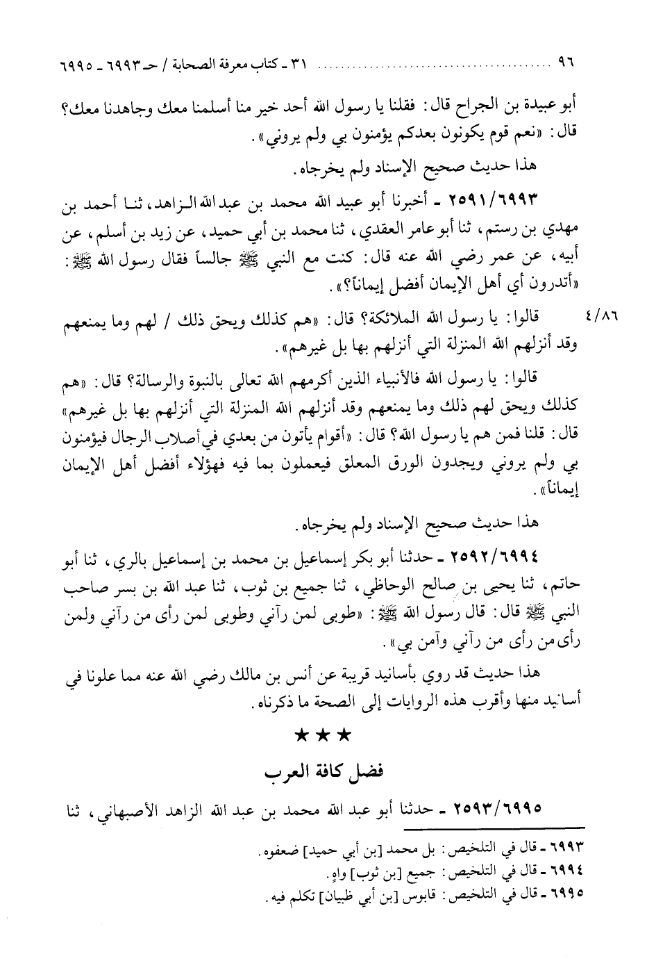 6993 - أَخْبَرَنَا أَبُو عُبَيْدِ اللَّهِ مُحَمَّدُ بْنُ عَبْدِ اللَّهِ الزَّاهِدُ، ثَنَا أَحْمَدُ بْنُ مَهْدِيِّ بْنِ رُسْتُمٍ، ثَنَا أَبُو عَامِرٍ الْعَقَدِيُّ، ثَنَا مُحَمَّدُ بْنُ أَبِي حُمَيْدٍ، عَنْ زَيْدِ بْنِ أَسْلَمَ، عَنْ أَبِيهِ، عَنْ عُمَرَ، رَضِيَ اللَّهُ عَنْهُ قَالَ: كُنْتُ مَعَ النَّبِيِّ صَلَّى اللهُ عَلَيْهِ وَسَلَّمَ جَالِسًا فَقَالَ رَسُولُ اللَّهِ صَلَّى اللهُ عَلَيْهِ وَسَلَّمَ: §«أَتَدْرُونَ أَيُّ أَهْلِ الْإِيمَانِ أَفْضَلُ إِيمَانًا؟» قَالُوا يَا رَسُولَ اللَّهِ الْمَلَائِكَةُ؟ قَالَ: «هُمْ كَذَلِكَ وَيَحِقُّ ذَلِكَ لَهُمْ وَمَا يَمْنَعُهُمْ وَقَدْ أَنْزَلَهُمُ اللَّهُ الْمَنْزِلَةَ الَّتِي أَنْزَلَهُمْ بِهَا بَلْ غَيْرُهُمْ» قَالُوا: يَا رَسُولَ اللَّهِ فَالْأَنْبِيَاءُ الَّذِينَ أَكْرَمَهُمُ اللَّهُ تَعَالَى بِالنُّبُوَّةِ وَالرِّسَالَةِ؟ قَالَ: «هُمْ كَذَلِكَ وَيَحِقُّ لَهُمْ ذَلِكَ وَمَا يَمْنَعُهُمْ وَقَدْ أَنْزَلَهُمُ اللَّهُ الْمَنْزِلَةَ الَّتِي أَنْزَلَهُمْ بِهَا بَلْ غَيْرُهُمْ» قَالَ: قُلْنَا: فَمَنْ هُمْ يَا رَسُولَ اللَّهِ؟ قَالَ: «أَقْوَامٌ يَأْتُونَ مِنْ بَعْدِي فِي أَصْلَابِ الرِّجَالِ فَيُؤْمِنُونَ بِي وَلَمْ يَرَوْنِي وَيَجِدُونَ الْوَرَقَ الْمُعَلَّقَ فَيَعْمَلُونَ بِمَا فِيهِ فَهَؤُلَاءِ أَفْضَلُ أَهْلِ الْإِيمَانِ إِيمَانًا» هَذَا حَدِيثٌ صَحِيحُ الْإِسْنَادِ وَلَمْ يُخَرِّجَاهُ "K6993 - بل محمد بن أبي حميد ضعفوه