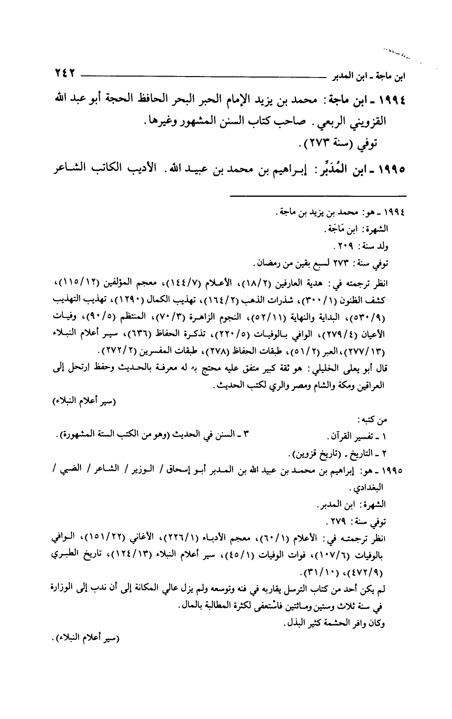 ابن ماجة: محمد بن يزيد الإمام الحبر البحر الحافظ الحجة أبو عبد الله القزويني الربعي. صاحب كتاب السنن المشهور وغيرها.