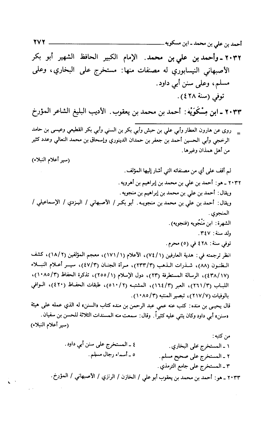 وأحمد بن علي بن محمد. الإمام الكبير الحافظ الشهير أبو بكر الأصبهاني النيسابوري له مصنفات منها: مستخرج على البخاري، وعلى مسلم، وعلى سنن أبي داود.