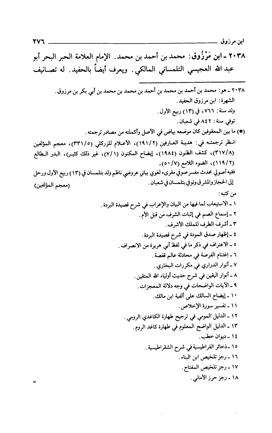 ابن مرزوق: محمد بن أحمد بن محمد. افمام العلامة الحبر البحر أبو عبد الله العجيسي التلمساني المالكي. ويعرف أيضاً بالحفيد. له تصانيف