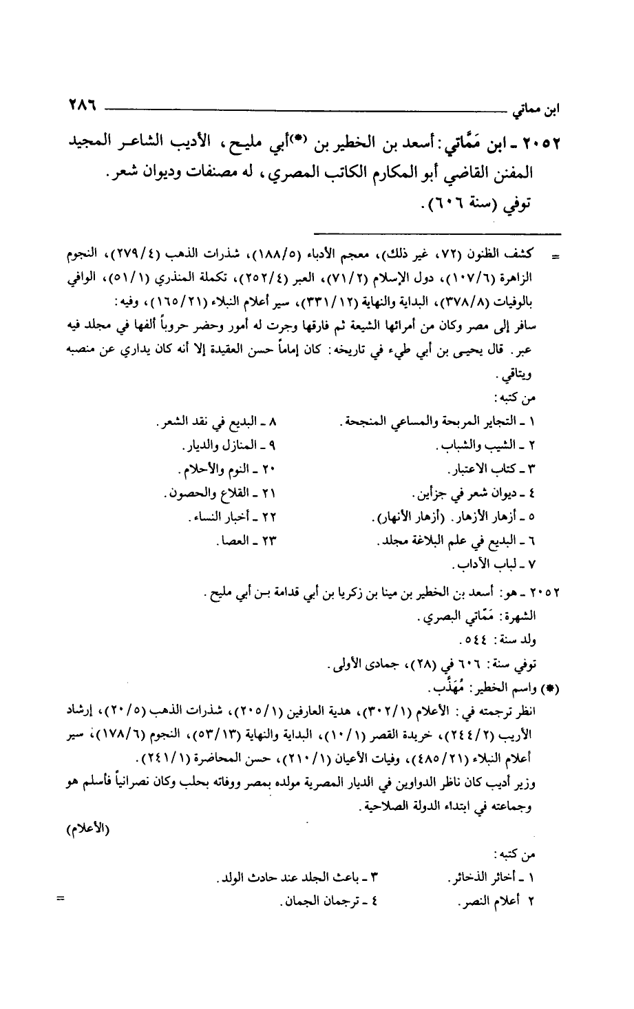 ابن مماتي: أسعد بن الخطير بن أبي مليح، الأديب الشاعر المجيد المفنن القاضي أبو المكارم الكاتب المصري، له مصنفات وديوان شعر.
